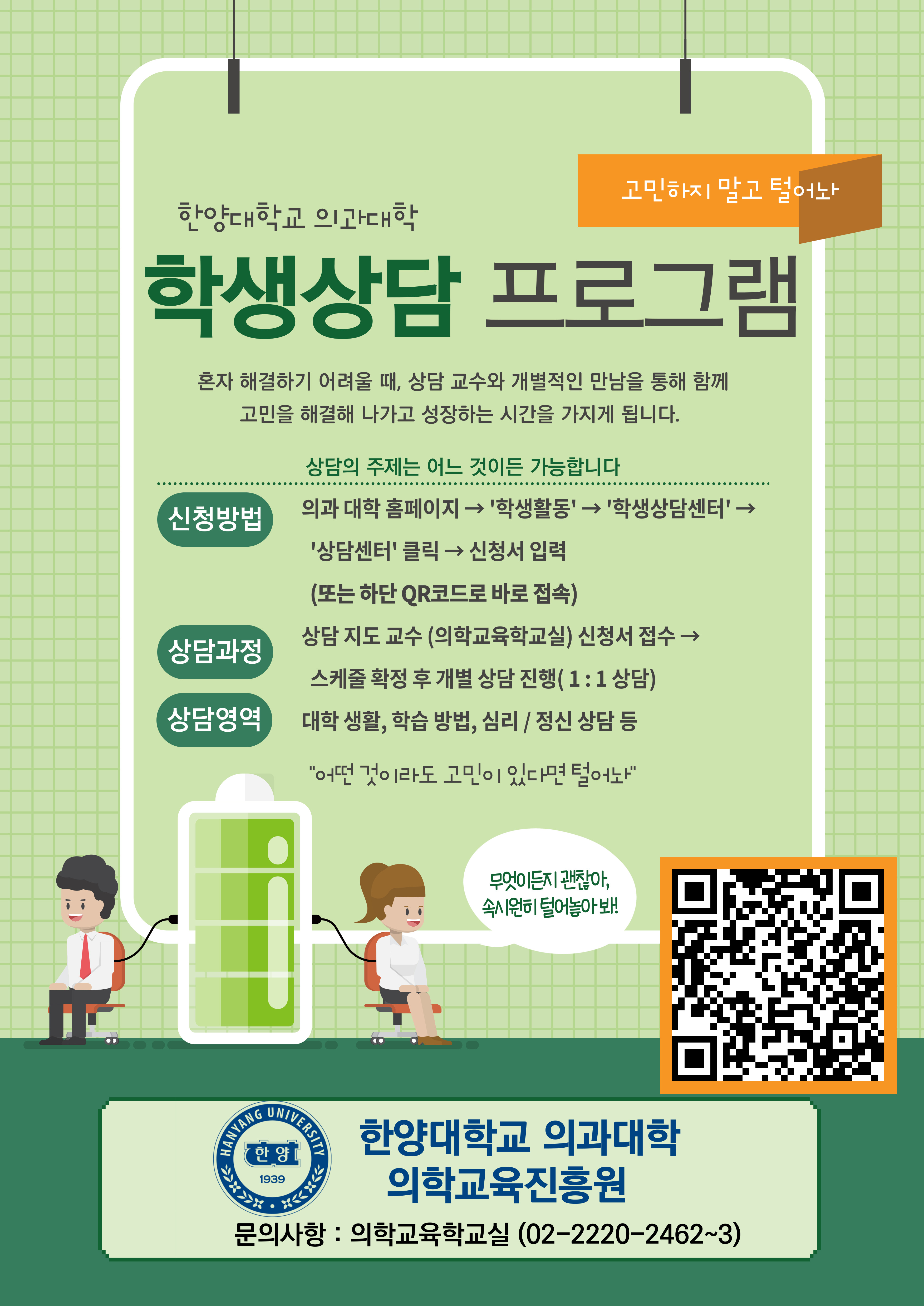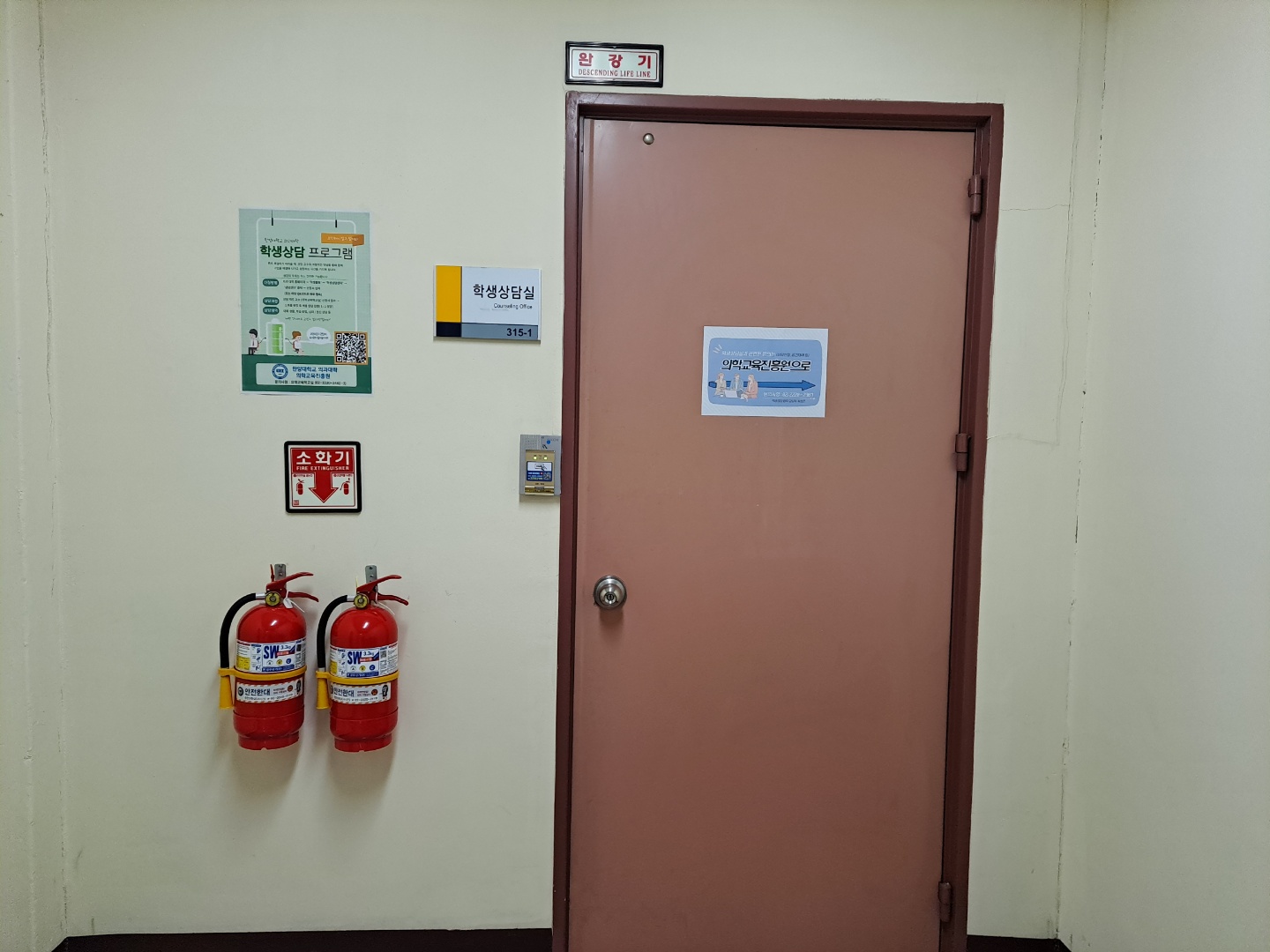 의학교육진흥원에서는 의과대학 학생들을 위해 상담을 진행하고 있습니다. 상담은 제1의학관 '학생상담실'과 의과대학본관 '그룹상담실'에서 일대일 또는 그룹 상담으로 진행됩니다.