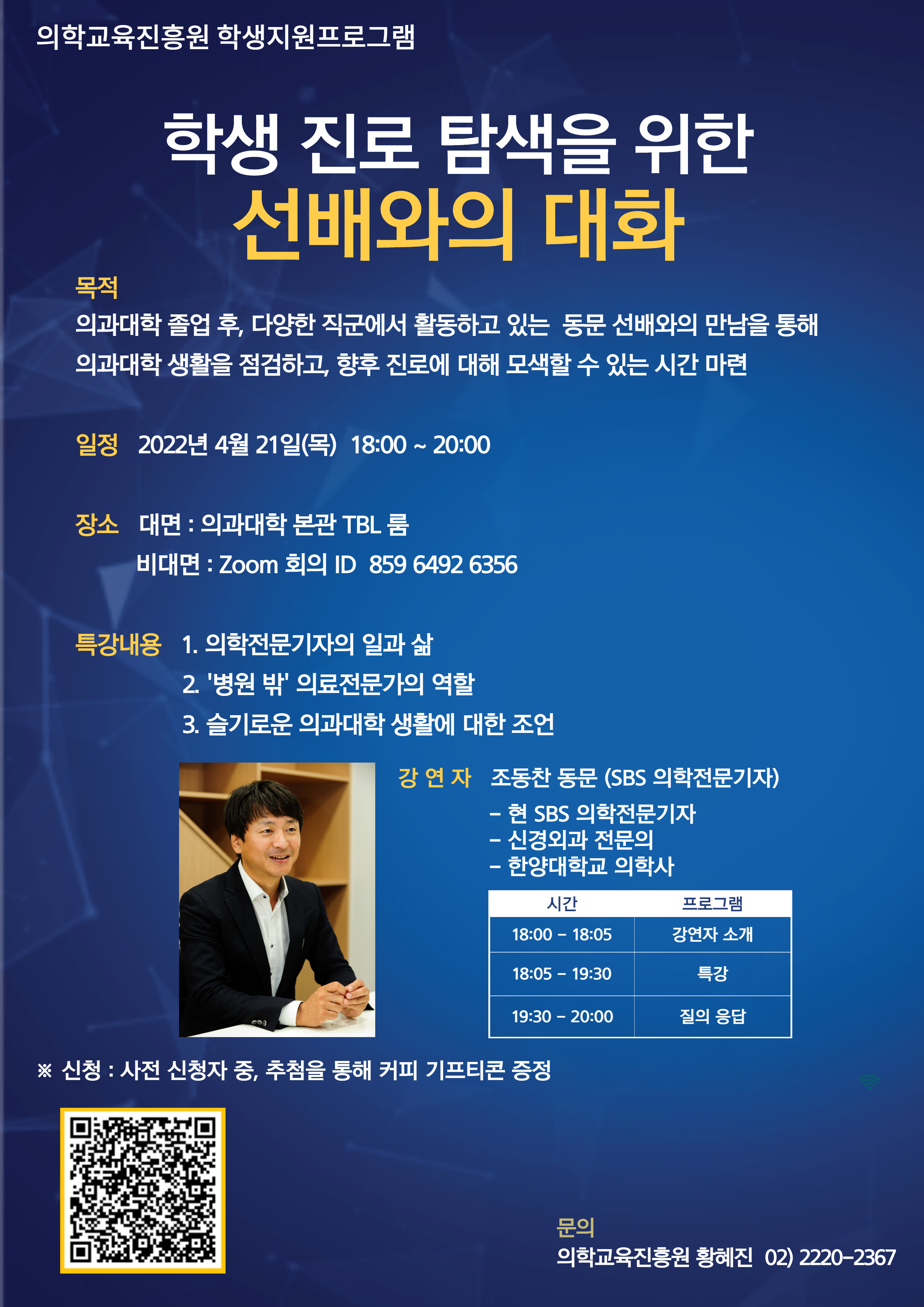 의학교육진흥원에서는 2022년 4월 21일 우리대학 동문인 조동찬 SBS 의학전문기자님을 모시고 특강을 진행했습니다. 특강의 내용은 의학전문기자의 일과 삶, 병원 밖 의료전문가의 역할, 대학 생활에 대한 조언 등이 있었습니다.