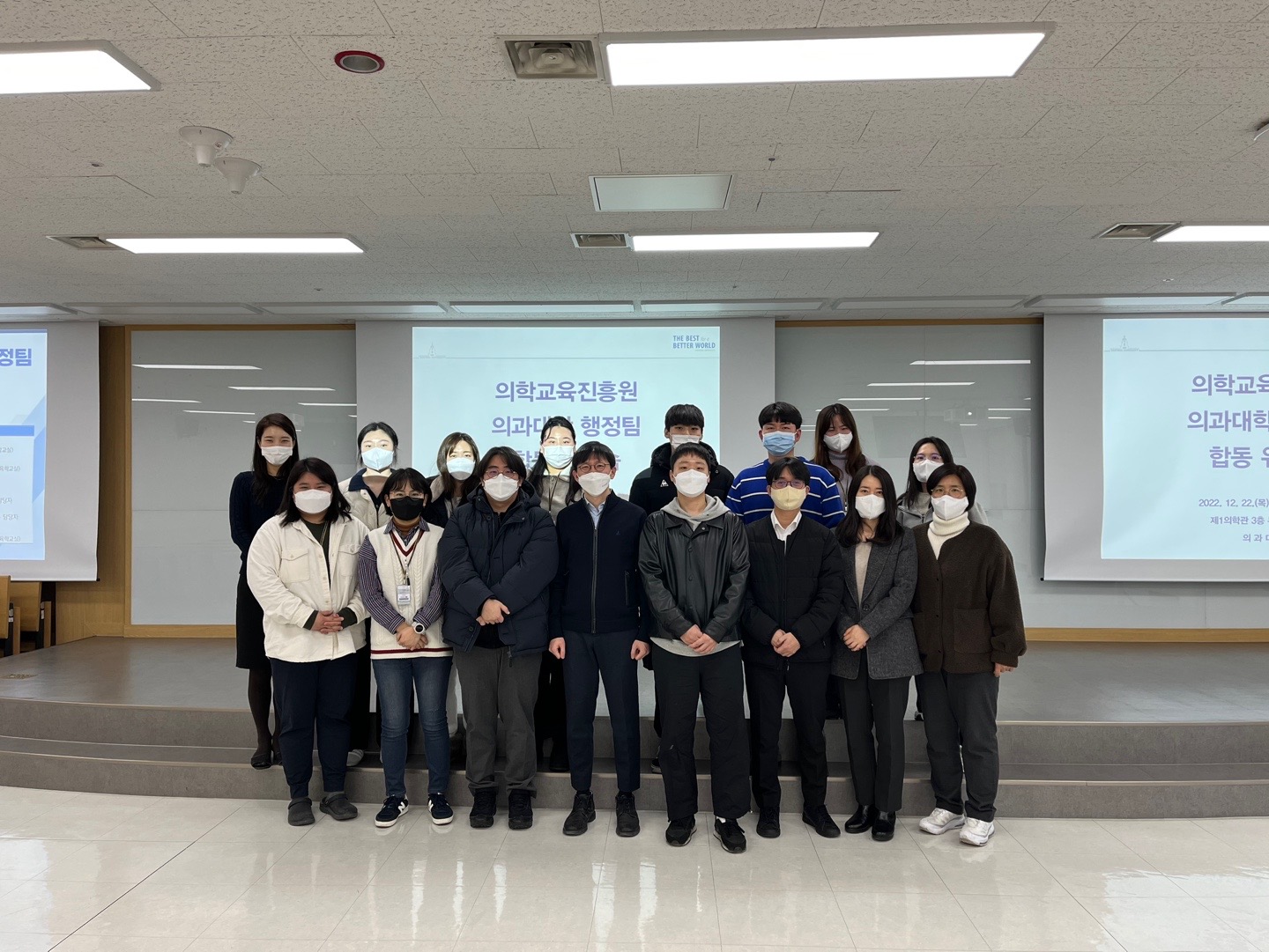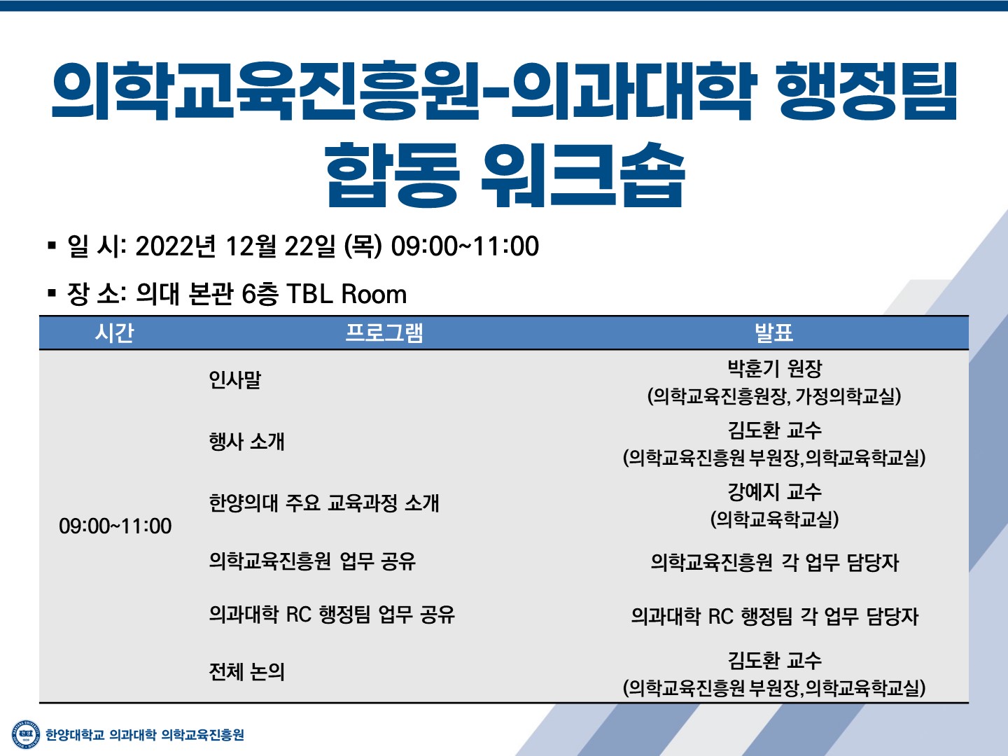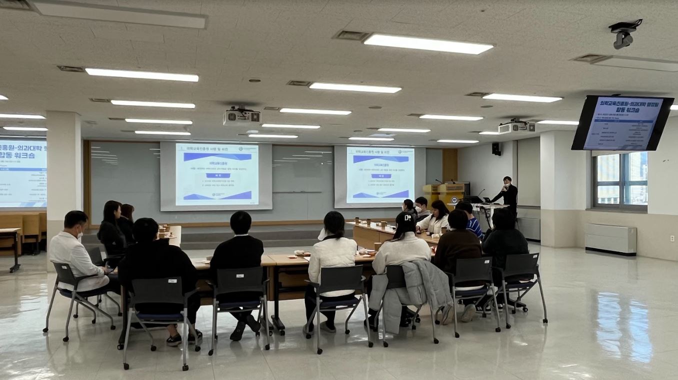 2022년 12월 22일 ‘의학교육진흥원-의과대학 행정팀 합동 워크숍’이 진행되었으며, 의학교육진흥원 및 의과대학 행정팀에서 15명의 직원 선생님이 참여하였습니다. 이번 워크숍은 직원 선생님들의 의학교육에 대한 이해를 높이고, 지난 1년을 회고/정리 및 서로의 업무를 공유하며 앞으로의 협력을 도모하기 위한 방안을 논의하고자 마련된 자리입니다. 박훈기 원장님(의학교육진흥원장, 가정의학교실)의 인사말을 시작으로, 김도환 교수님(의학교육진흥원 부원장, 의학교육학교실)께서 의학교육진흥원에 대한 소개를 해주셨습니다. 이어 강예지 교수님(의학교육학교실)께서 한양의대 주요 교육과정에 대해 소개해주셨습니다. 이후 각 선생들께서 담당 업무 공유를 해주셨으며, 개선을 위한 전체 논의가 진행되었습니다.