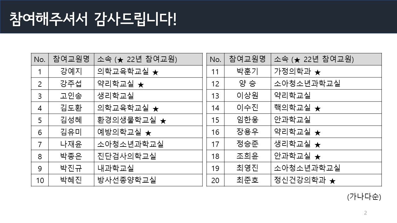 23년도 의학과 2학년 학생 총 99명을 위해서, 총 20명의 교수님들께서 자발적으로 본 프로그램에 참여하여 상담을 진행해주셨습니다. 참여 교수님들을 위한 사전 교육은 의학교육학교실 강예지 교수님께서 진행해주셨고, 전수 상담은 3월 중순부터 4월 중순까지 약 4주간 진행되었습니다. 상담 결과는 ‘의학과 2학년 실태조사 보고서’로 정리되어 교육과정위원회에 보고되고 있습니다.