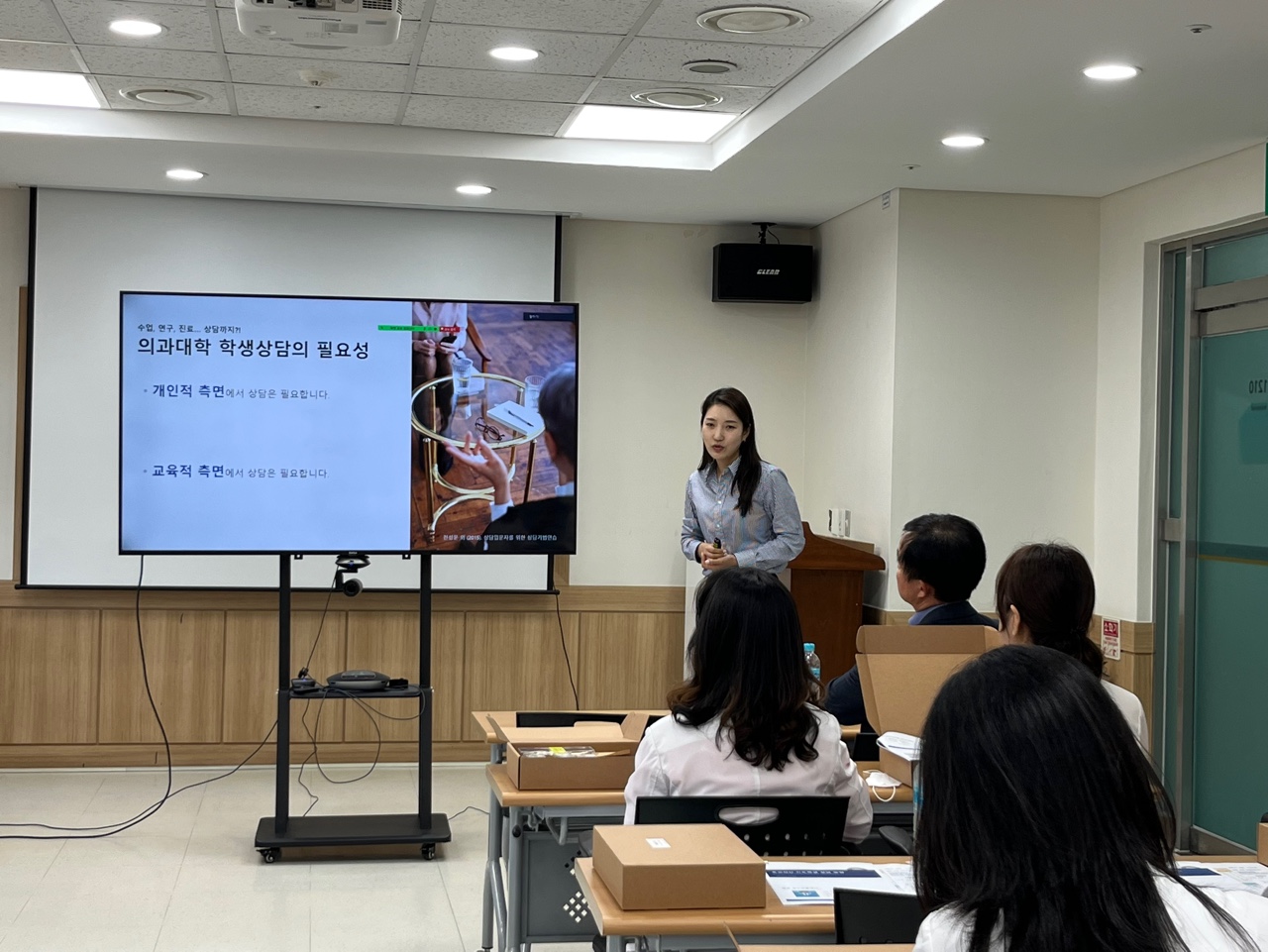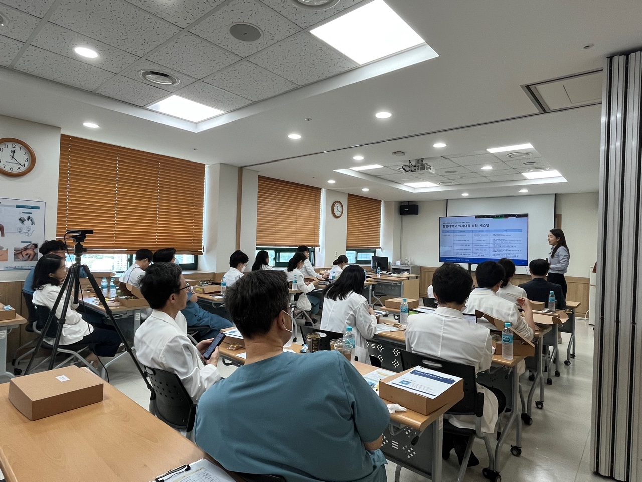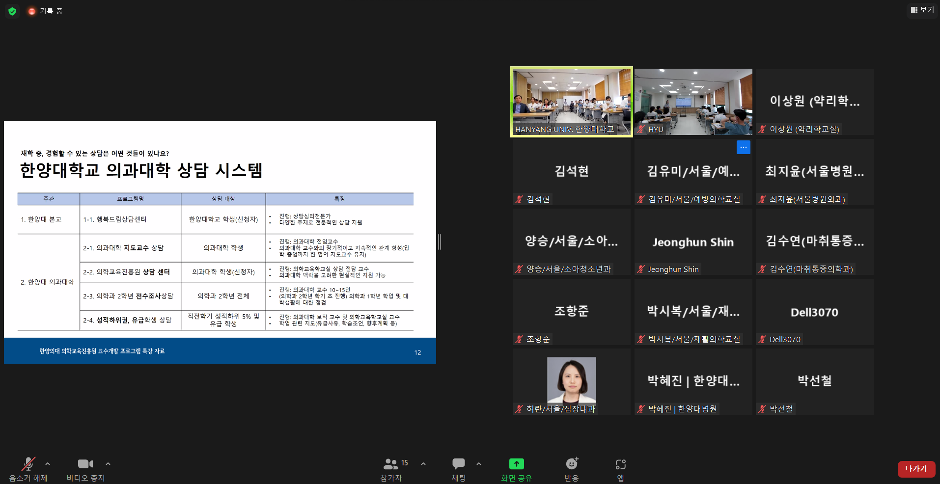 5월 교수개발 프로그램은 <효과적인 지도학생 상담 방법>을 주제로 의학교육학교실 강예지 교수님께서 강의를 진행해 주셨습니다. 이번 교육프로그램은 지도학생 상담 제도의 활성화를 목적으로, 지도교수 상담의 필요성, 의과대학생의 특성, 상담 전략 등이 교육 내용으로 다뤄졌습니다. 이번 달에는 우리 대학의 수련병원인 구리 한양대병원에서 진행되었고, 점심시간을 이용하며 많은 교수님들께서 참여하여 주셨습니다. 또한 비대면 동시 진행으로 서울병원 교수님 및 기초교수님을 포함하여 약 35명의 교수님께서 참석해주셨습니다.