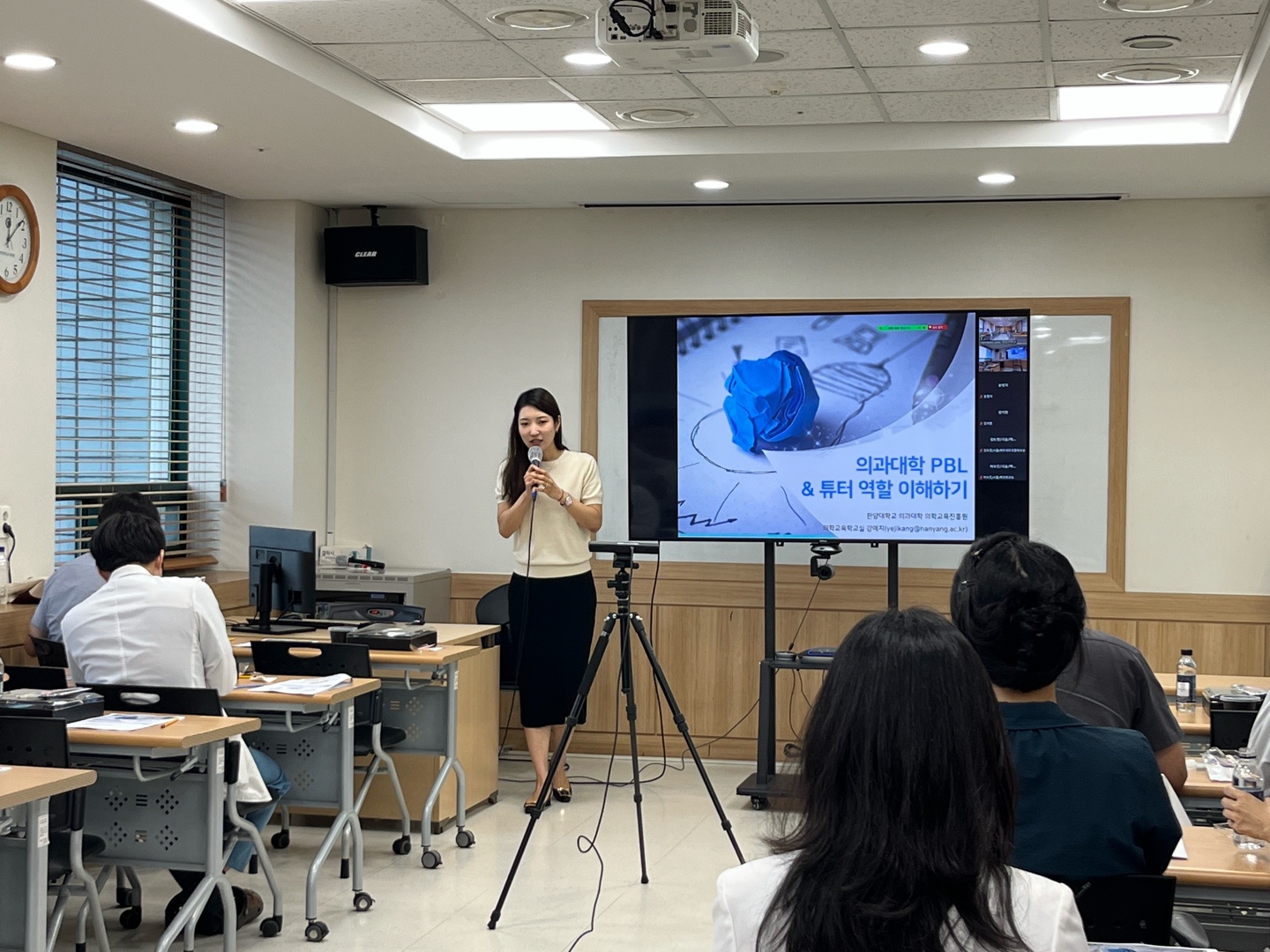 8월 교수개발 프로그램은 <PBL 이해하기 및 튜터 역할>을 주제로 의학교육학교실 강예지 교수님께서 강의를 진행해 주셨습니다. 이번 교육프로그램에서는 문제중심학습(Problem-based learning, PBL)의 이해를 바탕으로 한양의대에서 진행되고 있는 PBL 교육과정과 PBL을 진행하기 위한 튜터 전략 등을 다루었습니다. 강의 이후에는 질의응답을 통해 PBL 진행 방법에 관한 토론을 나눴습니다. 본 프로그램에는 약 35명의 교수님께서 대면 및 비대면으로 교육에 참여해 주셨습니다.
