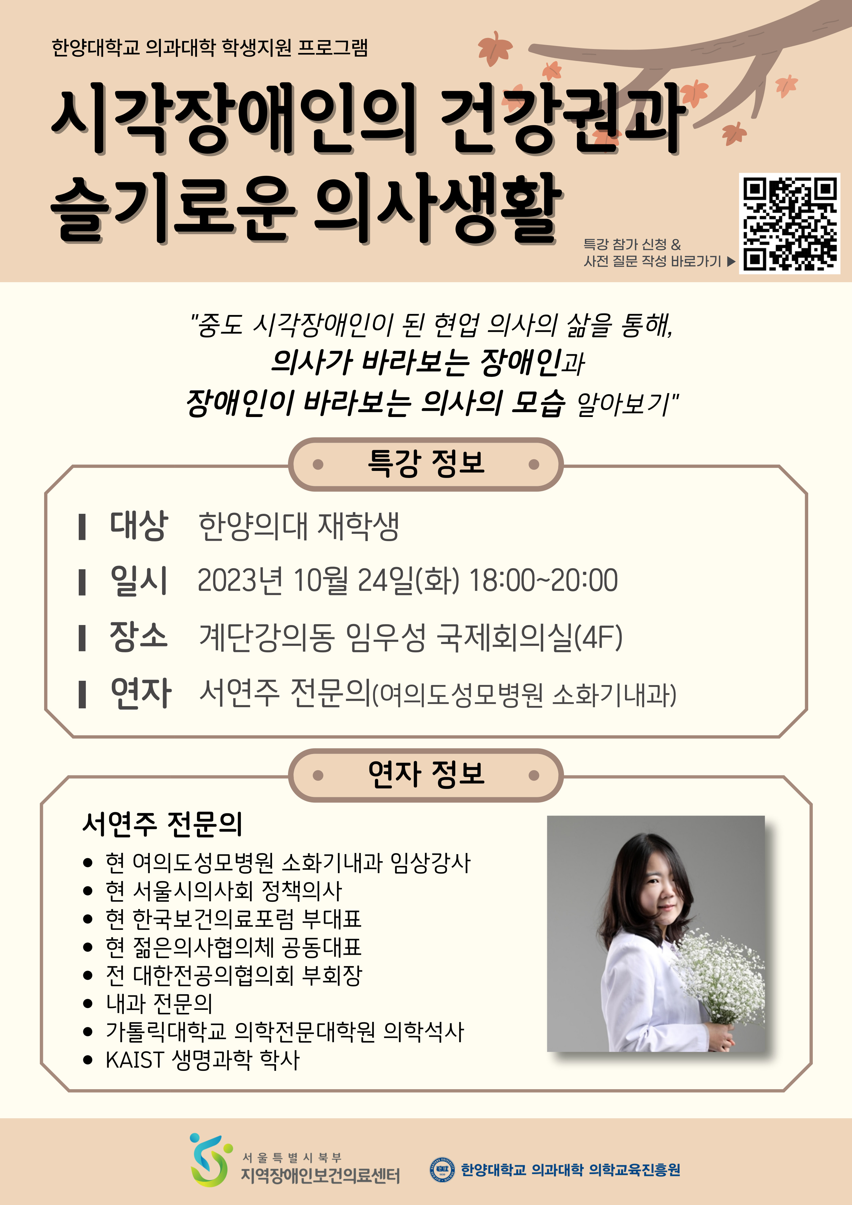 2023년 10월 24일 한양의대 재학생을 대상으로 <시각장애인의 건강권과 슬기로운 의사생활>이라는 주제로 특강이 진행되었습니다. 연자로 모신 여의도성모병원 소화기 내과 서연주 전문의 선생님께서는 의사로 활동하시면서 불의의 사고를 겪으며 환자로 지내본 경험과, 장애를 받아들이기까지의 과정을 통해 어떤 성찰을 하게 되었는지에 대한 이야기를 쉽고 편안한 분위기 속에서 말씀해 주셨습니다. 더불어, 특강에서는 우리 사회에서 시각장애인을 바라보는 시선과 인식, 그리고 이와 관련하여 예비 의료인을 양성하는 의과대학 교육과정에서도 어떠한 교육 내용들이 다뤄지면 좋을지와 같이, 특강 이후에도 참석자들이 지속해서 고민해 볼 주제들을 편안한 분위기 속에서 나눌 수 있었습니다. 강의가 종료된 후에도 의예과와 의학과 학생들의 활발한 질의응답이 이어졌고, 의과대학 및 병원에서 배리어 프리(barrier free)를 실천하기 위한 방안과 환자에게 좋은 의사란 어떤 특징과 모습을 보여주어야 하는가 대해 논의하기도 하였습니다. 해당 특강에는 50여 명의 학생들이 참석하였습니다.