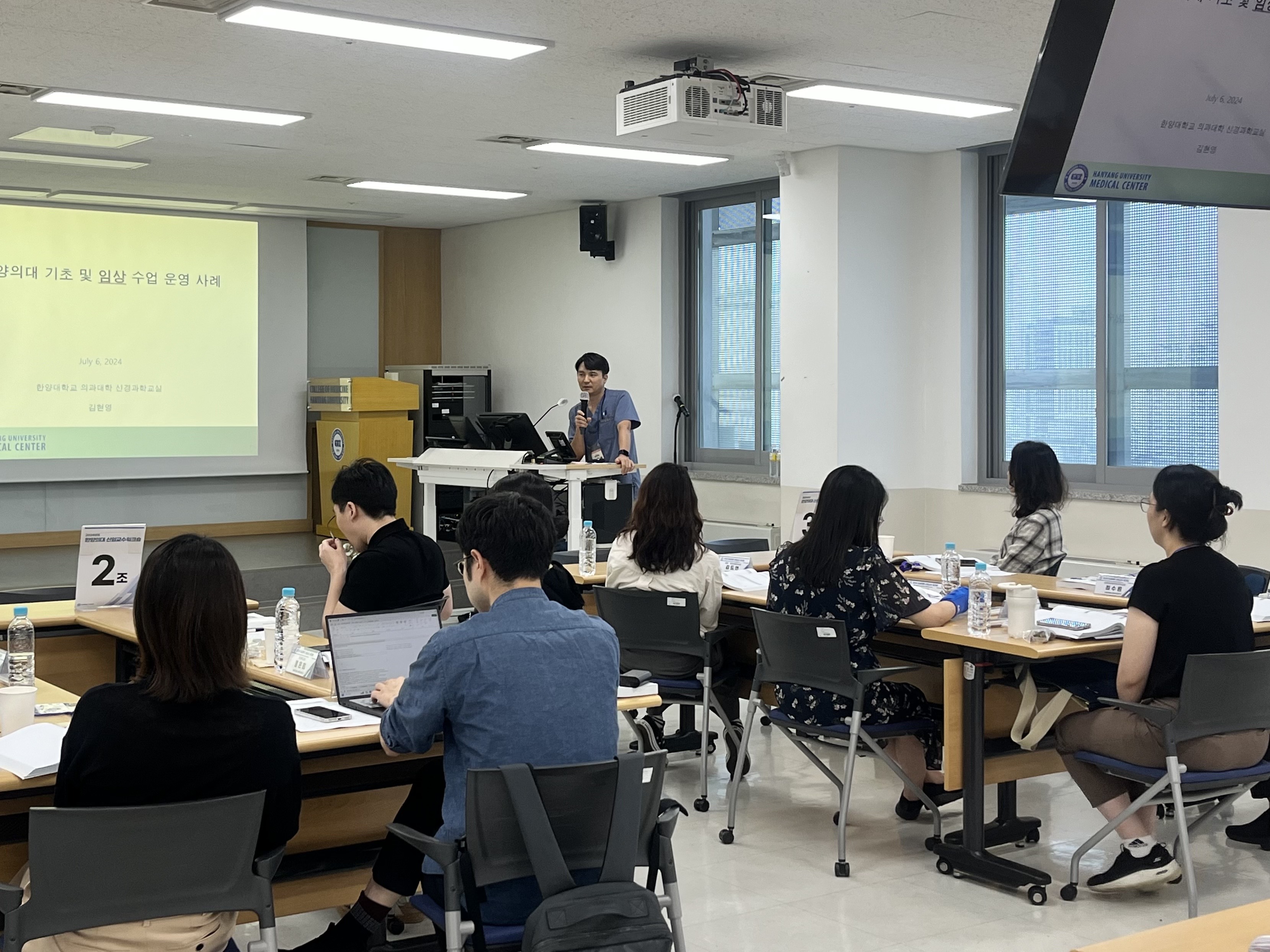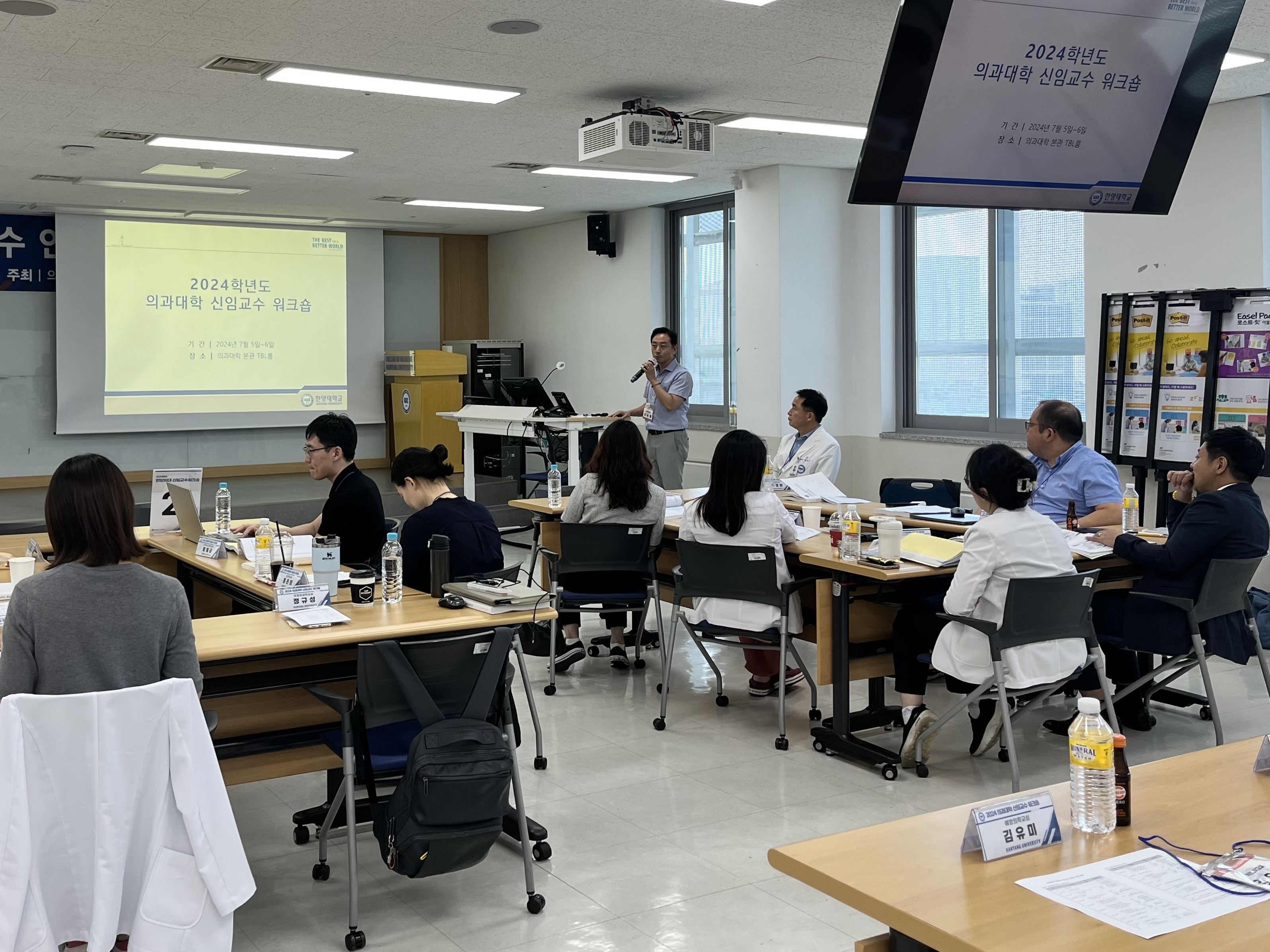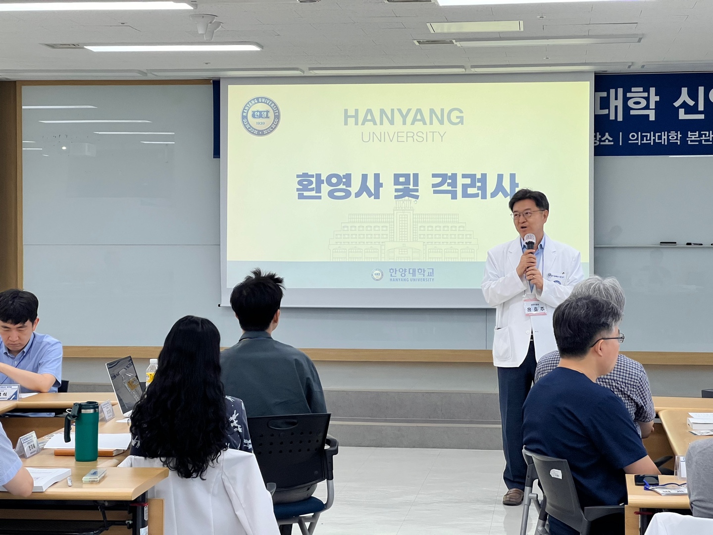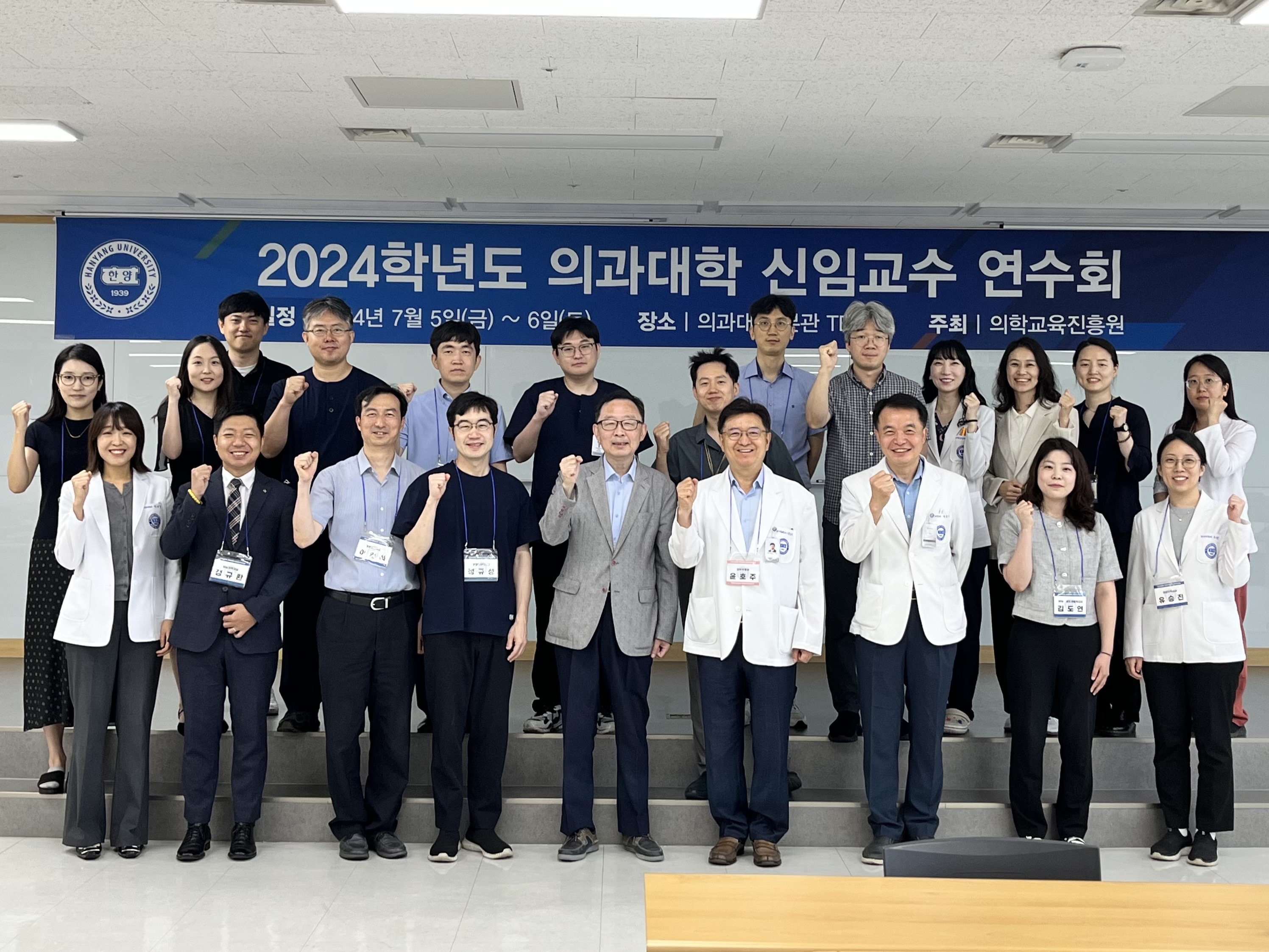 2024년 7월 5-6일 양일간, 신임교수워크숍이 진행되었습니다. 이번 워크숍은 한양대학교 의과대학 본관 TBL 룸에서 진행되었으며, ‘한양의대 교육과정’, ‘우리 대학 행정 체계’, ‘의과대학 강의/임상실습’, ‘의과대학교수의 커리어 개발’, ‘의과대학생 지도 상담의 이해’, ‘대학 본부’, ‘의학 교육 평가인증’, ‘PBL 교육과정’ 등 교원에게 필요한 내용들로 구성되었습니다. 강연자로는 박훈기(의학교육진흥원장, 가정의학교실), 강예지(의학교육학교실) 교수가 진행과 강의를 맡았으며, 최동호(교무부학장, 외과학교실), 황세진(해부‧세포생물학), 김유미(예방의학교실), 엄지은(내과학교실), 유상호(의료인문학교실), 나재윤(소아청소년과학교실), 김현영(신경과학교실), 최중섭(대외협력처장, 산부인과학교실), 류제일(임상교육과장-구리, 신경외과학교실) 교수가 교육 경험을 공유해 주시는 시간을 가졌습니다. 외부 강연자로는 명예 교수 한중수 교수님(생화학‧분자생물학교실)께서 ‘의과대학교수로서의 리더십’이라는 주제로 특강을 진행해 주셨습니다. 그 밖에 고현철(의과대학장, 약리학교실), 윤호주(의무부총장, 내과학교실), 고주연(의학과장, 피부과학교실) 보직교수님께서 격려차 함께해 주셨습니다.