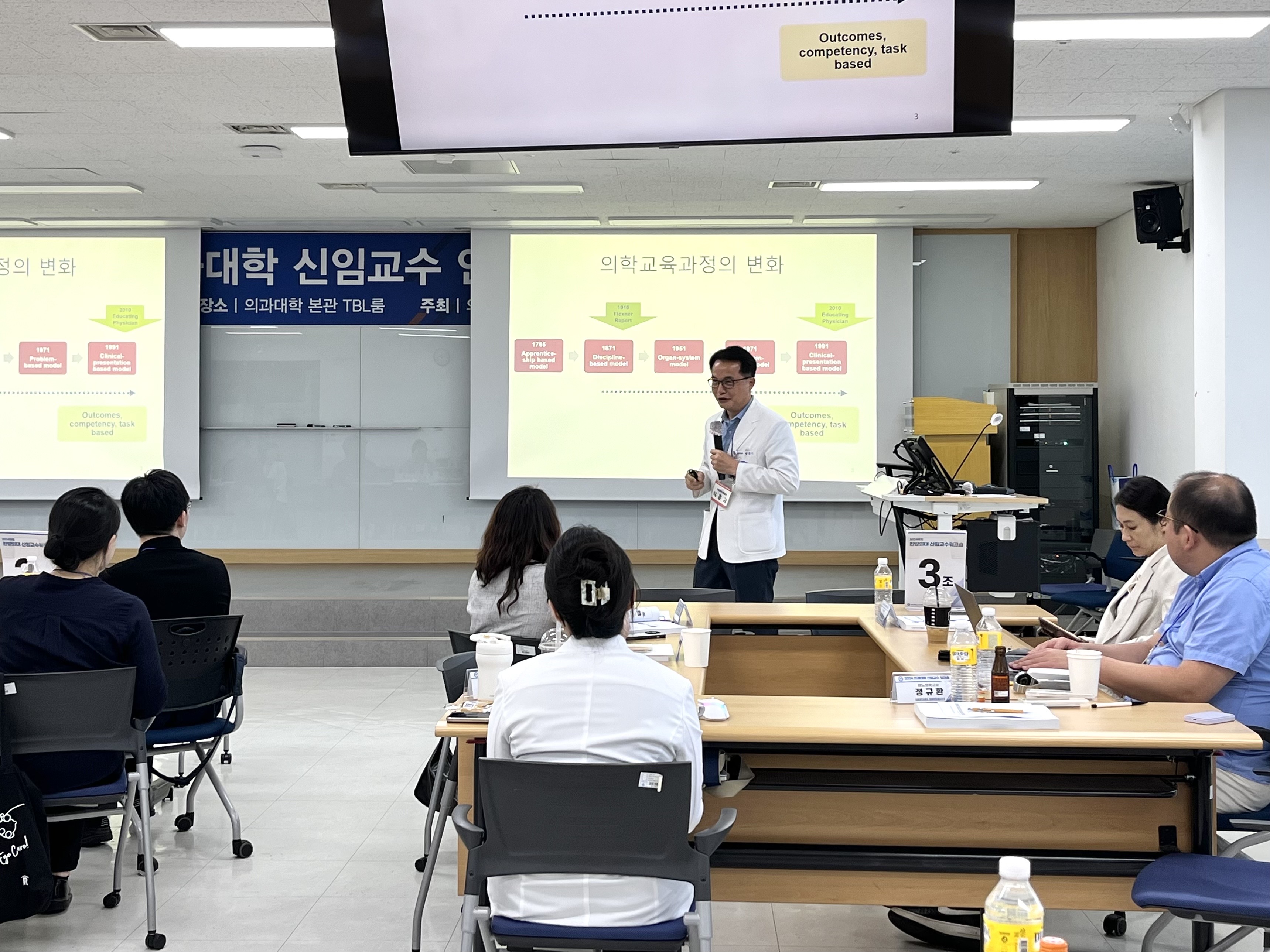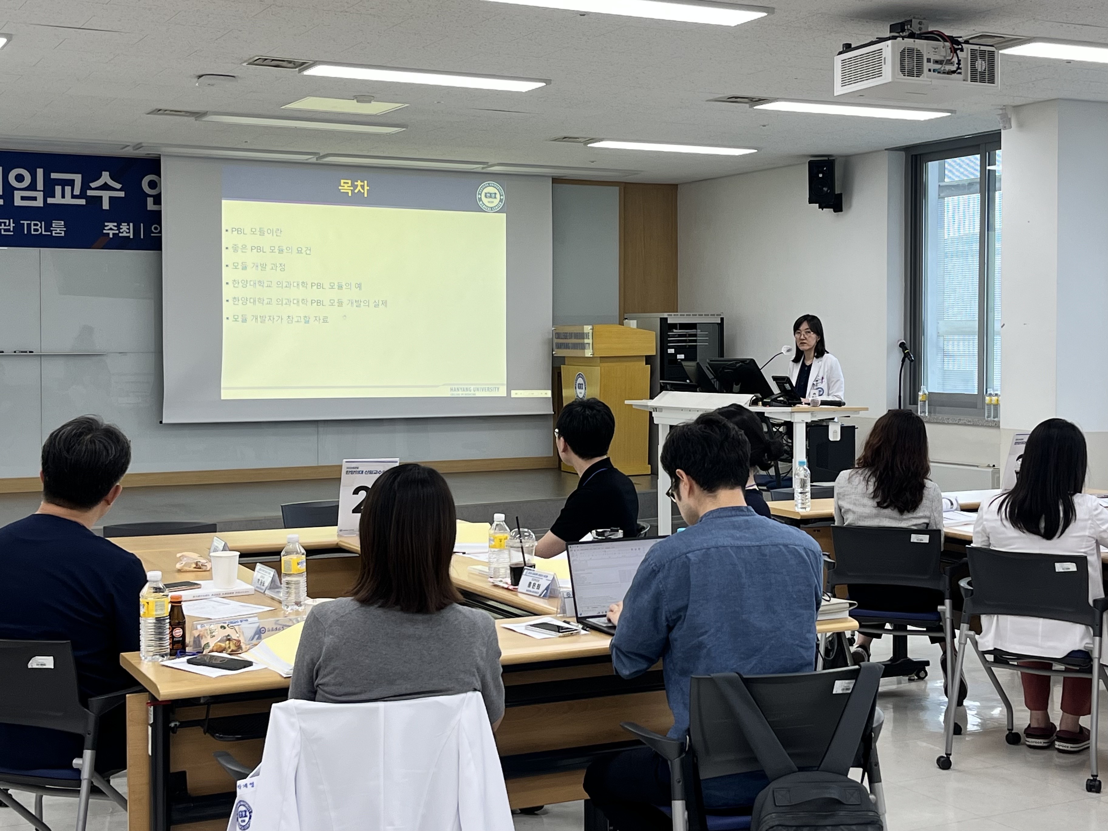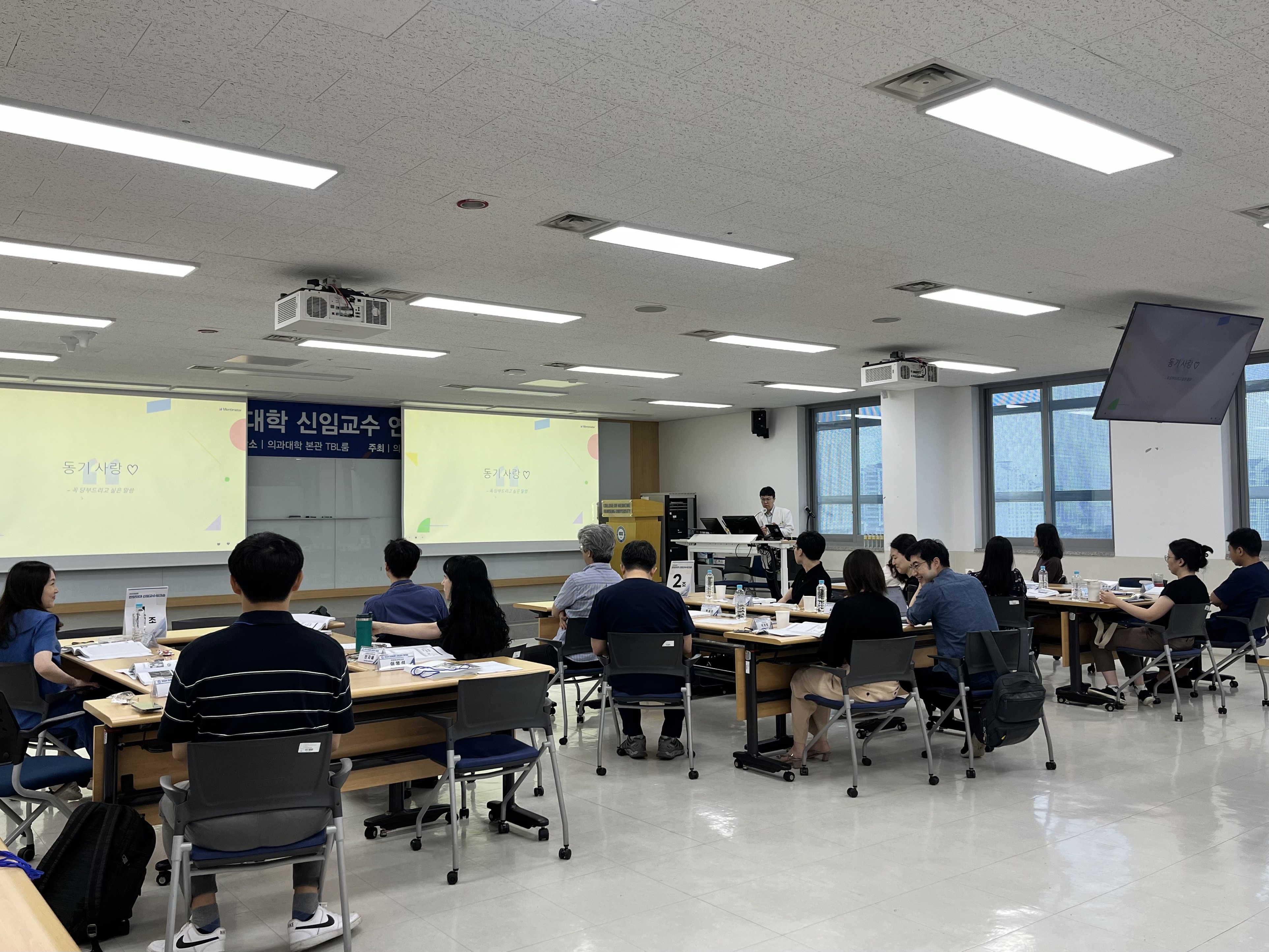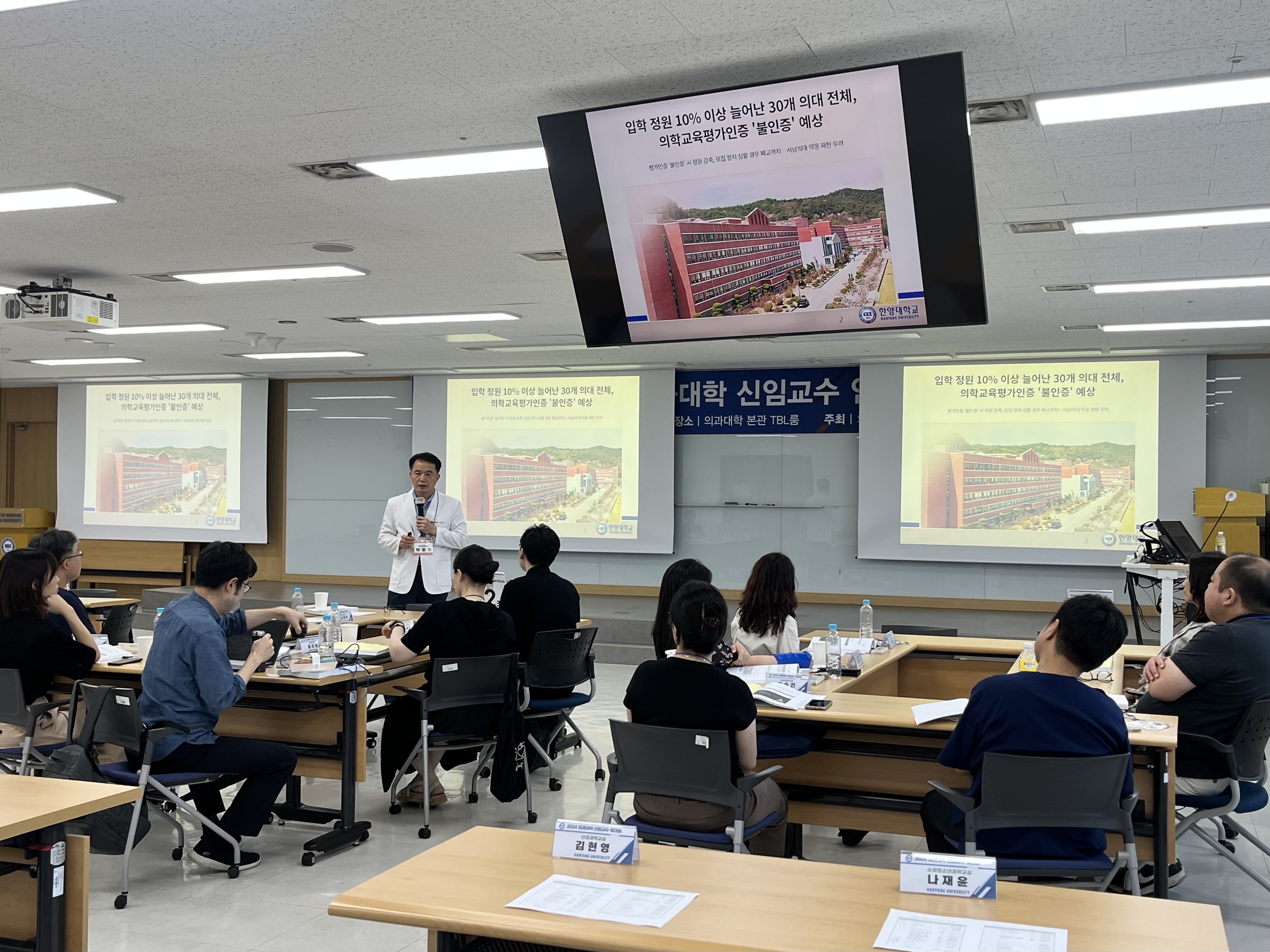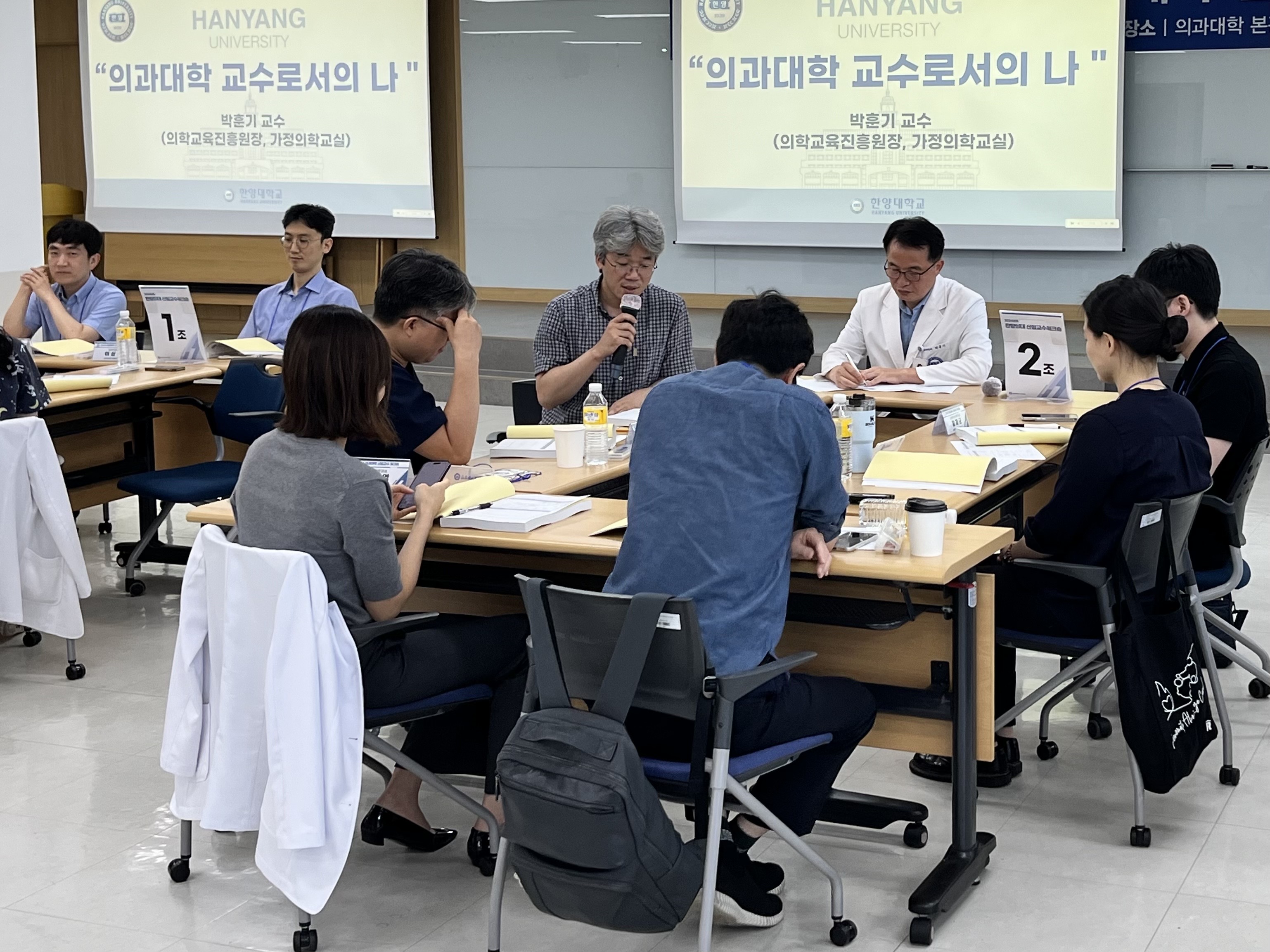 2024년 7월 5-6일 양일간, 신임교수워크숍이 진행되었습니다. 이번 워크숍은 한양대학교 의과대학 본관 TBL 룸에서 진행되었으며, ‘한양의대 교육과정’, ‘우리 대학 행정 체계’, ‘의과대학 강의/임상실습’, ‘의과대학교수의 커리어 개발’, ‘의과대학생 지도 상담의 이해’, ‘대학 본부’, ‘의학 교육 평가인증’, ‘PBL 교육과정’ 등 교원에게 필요한 내용들로 구성되었습니다. 강연자로는 박훈기(의학교육진흥원장, 가정의학교실), 강예지(의학교육학교실) 교수가 진행과 강의를 맡았으며, 최동호(교무부학장, 외과학교실), 황세진(해부‧세포생물학), 김유미(예방의학교실), 엄지은(내과학교실), 유상호(의료인문학교실), 나재윤(소아청소년과학교실), 김현영(신경과학교실), 최중섭(대외협력처장, 산부인과학교실), 류제일(임상교육과장-구리, 신경외과학교실) 교수가 교육 경험을 공유해 주시는 시간을 가졌습니다. 외부 강연자로는 명예 교수 한중수 교수님(생화학‧분자생물학교실)께서 ‘의과대학교수로서의 리더십’이라는 주제로 특강을 진행해 주셨습니다. 그 밖에 고현철(의과대학장, 약리학교실), 윤호주(의무부총장, 내과학교실), 고주연(의학과장, 피부과학교실) 보직교수님께서 격려차 함께해 주셨습니다.