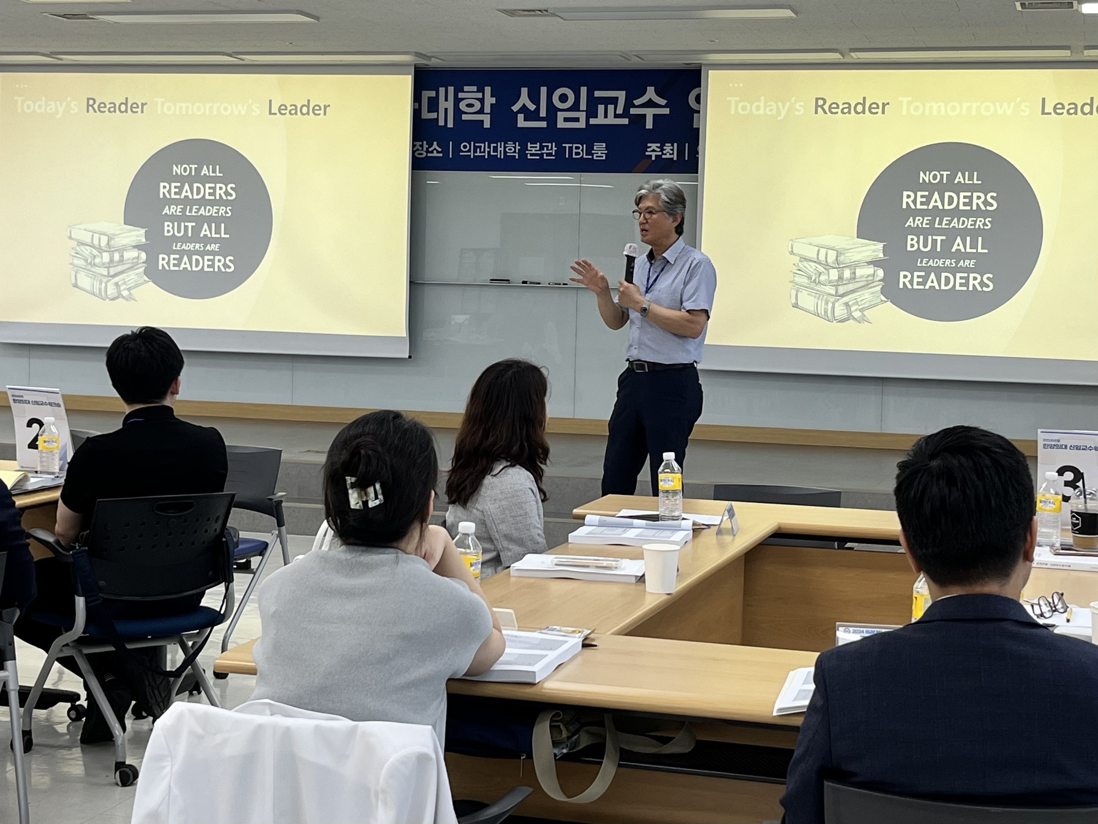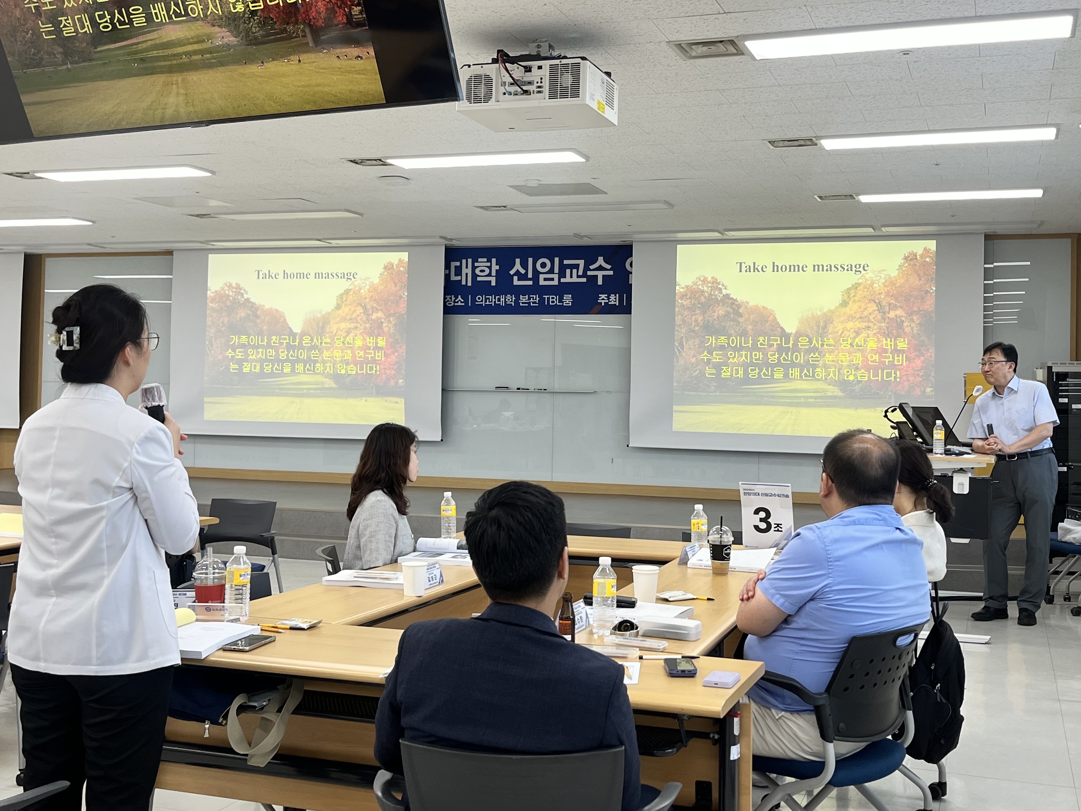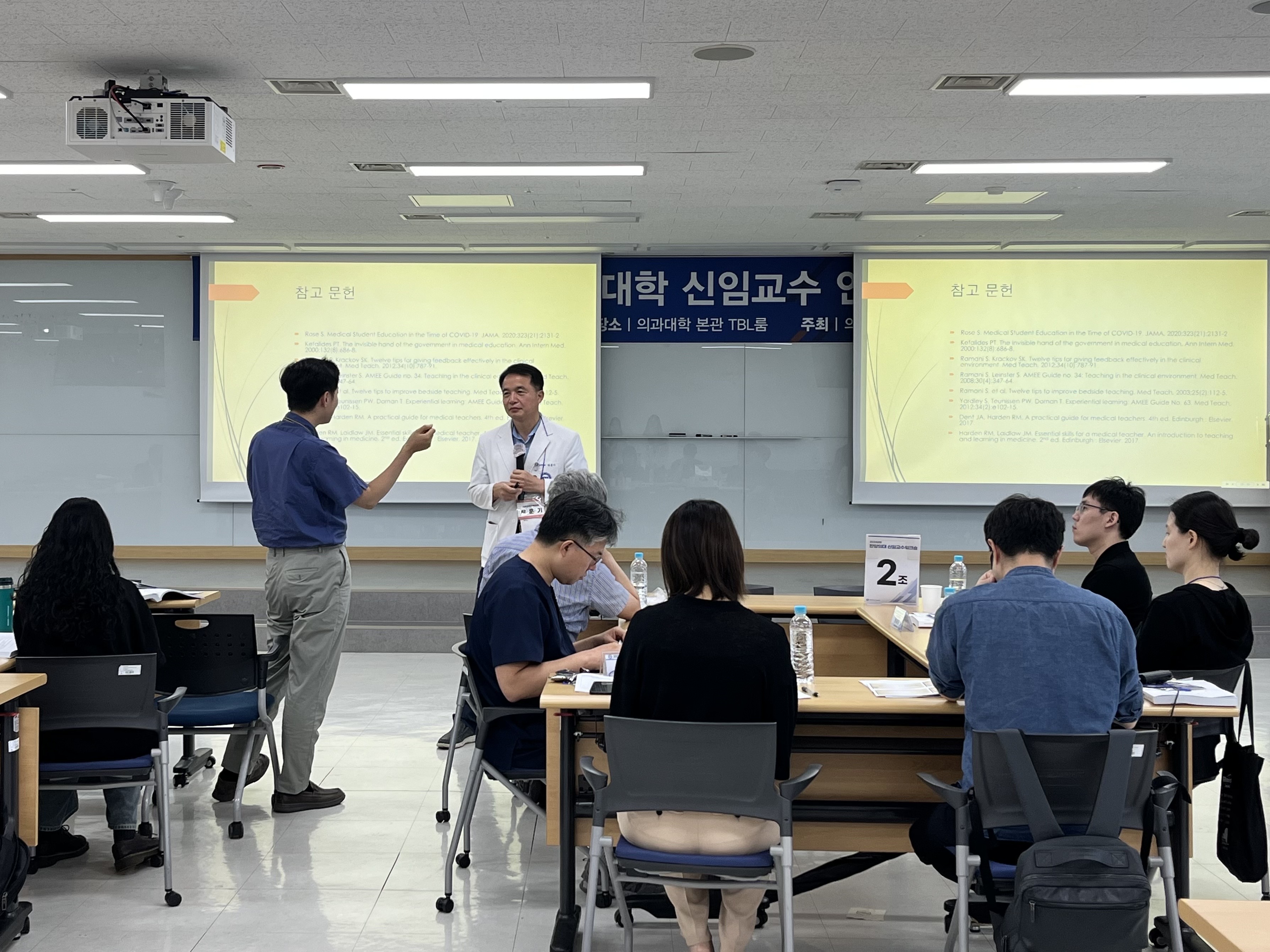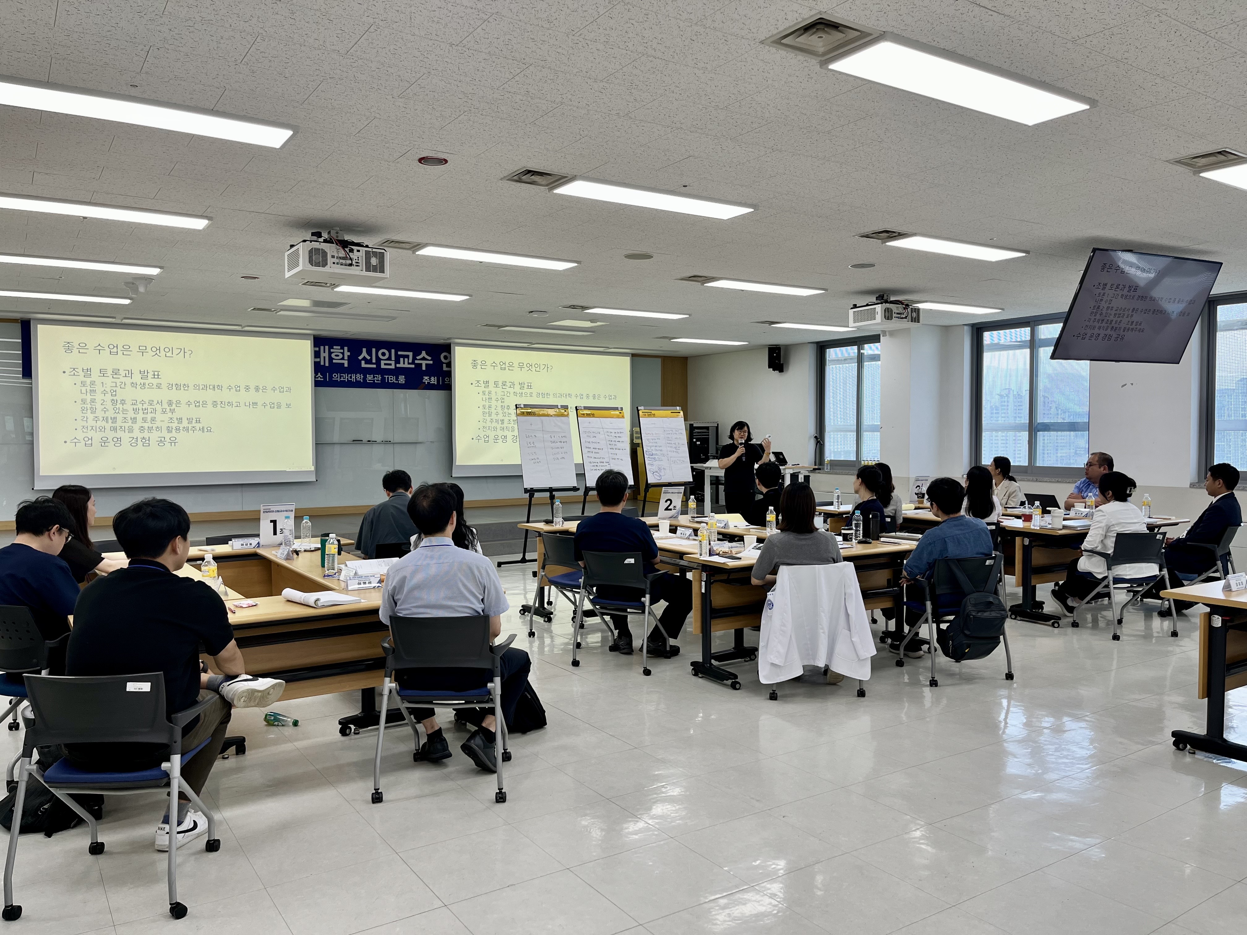 2024년 7월 5-6일 양일간, 신임교수워크숍이 진행되었습니다. 이번 워크숍은 한양대학교 의과대학 본관 TBL 룸에서 진행되었으며, ‘한양의대 교육과정’, ‘우리 대학 행정 체계’, ‘의과대학 강의/임상실습’, ‘의과대학교수의 커리어 개발’, ‘의과대학생 지도 상담의 이해’, ‘대학 본부’, ‘의학 교육 평가인증’, ‘PBL 교육과정’ 등 교원에게 필요한 내용들로 구성되었습니다. 강연자로는 박훈기(의학교육진흥원장, 가정의학교실), 강예지(의학교육학교실) 교수가 진행과 강의를 맡았으며, 최동호(교무부학장, 외과학교실), 황세진(해부‧세포생물학), 김유미(예방의학교실), 엄지은(내과학교실), 유상호(의료인문학교실), 나재윤(소아청소년과학교실), 김현영(신경과학교실), 최중섭(대외협력처장, 산부인과학교실), 류제일(임상교육과장-구리, 신경외과학교실) 교수가 교육 경험을 공유해 주시는 시간을 가졌습니다. 외부 강연자로는 명예 교수 한중수 교수님(생화학‧분자생물학교실)께서 ‘의과대학교수로서의 리더십’이라는 주제로 특강을 진행해 주셨습니다. 그 밖에 고현철(의과대학장, 약리학교실), 윤호주(의무부총장, 내과학교실), 고주연(의학과장, 피부과학교실) 보직교수님께서 격려차 함께해 주셨습니다.