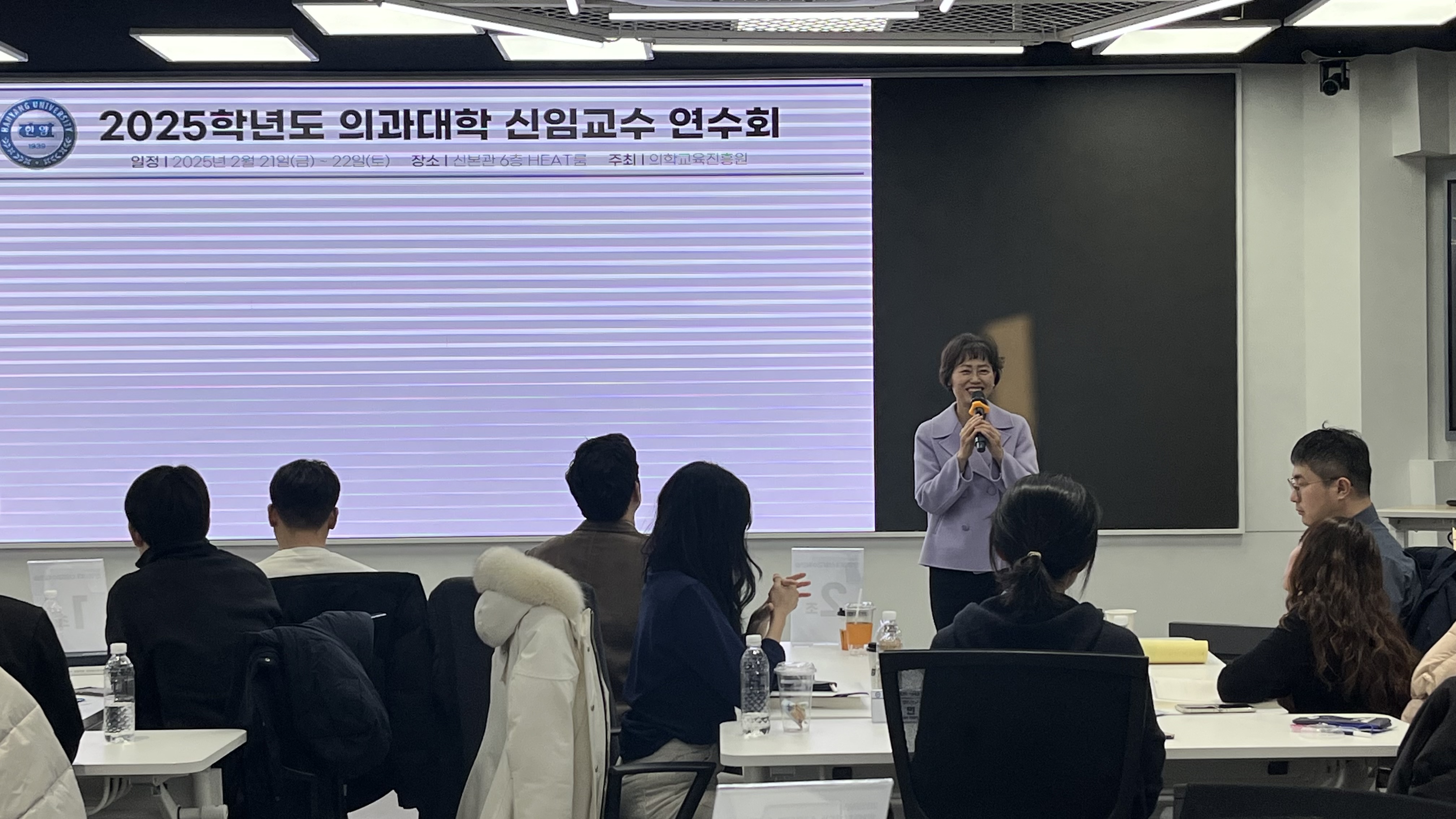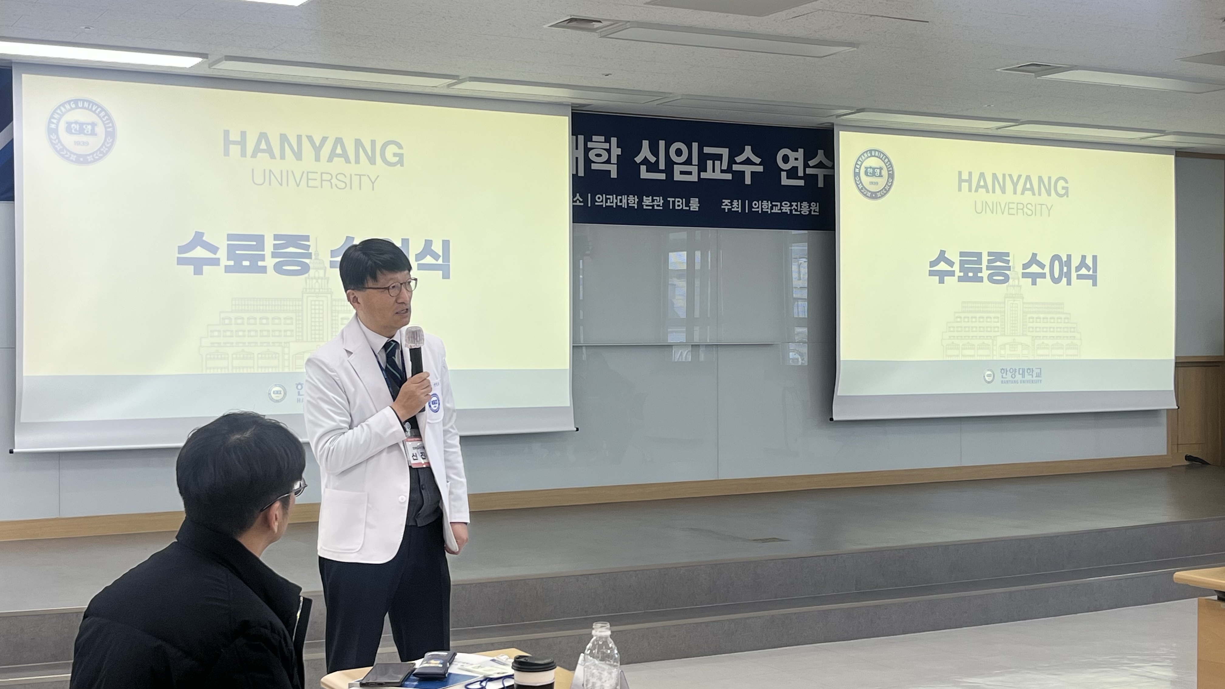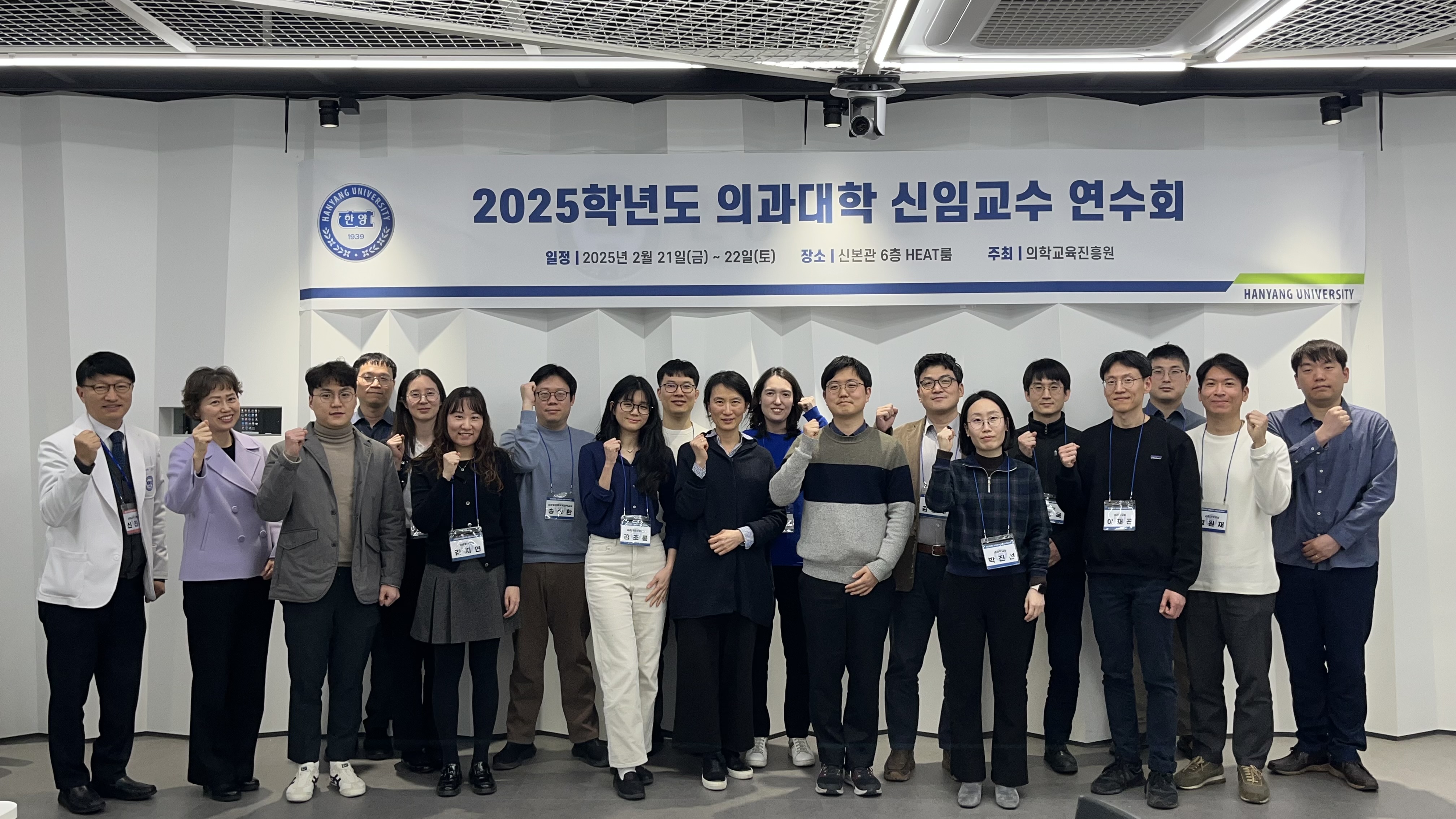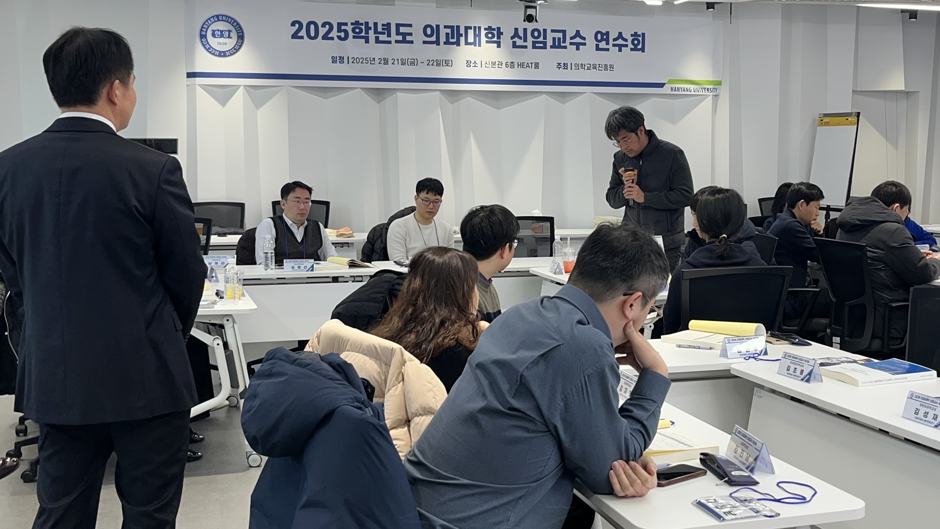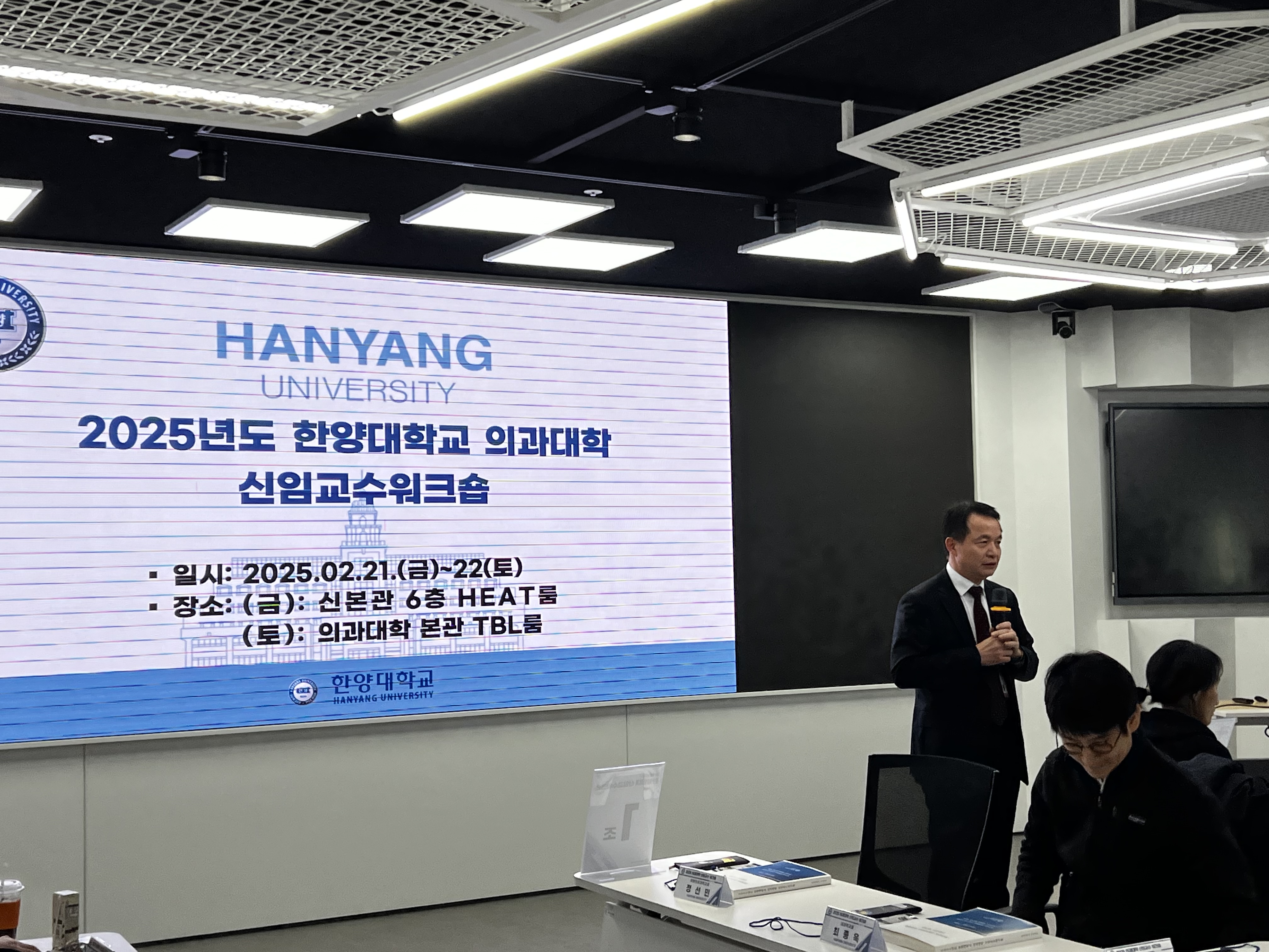 2025년 2월 21-22일 양일 간, 신임교수워크숍이 진행되었습니다. 이번 워크숍은 한양대학교 신본관 HEAT룸 및 의과대학 본관 TBL룸에서 진행되었으며, ‘한양의대 교육과정’, ‘우리 대학 행정 체계’, ‘의과대학 강의/임상실습’, ‘의과대학 교수의 커리어 개발’, ‘의과대학생 지도 상담의 이해’, ‘대학 본부’, ‘의학교육 평가인증’, ‘PBL 교육과정’ 등 교원에게 필요한 내용들로 구성되었습니다. 연자로는 박훈기(의과대학장, 가정의학교실), 신진호(의학교육진흥원장, 내과학교실) 교수가 진행과 강의를 맡았으며, 최중섭(대외협력처장, 산부인과학교실), 전대원(연구부학장, 내과학교실), 김유미(예방의학교실), 유상호(의료인문학교실), 나재윤(소아청소년과학교실), 이건석(정신건강의학교실), 신정훈(임상교육과장(구리), 내과학교실), 엄지은(내과학교실) 교수가 교육 경험을 공유해주시는 시간을 가졌습니다. 외부 연자로는 명예 교수 한중수 교수님(생화학‧분자생물학교실), 이효정 연구강사(아주대학교 의과대학 의학교육학교실) 께서 ‘의과대학 교수로서의 리더십’ 및 ‘계통강의 이해와 평가’라는 주제로 특강을 진행해주셨습니다. 그 밖에 윤호주(의무부총장, 내과학교실), 윤지희(교무부학장, 해부‧세포생물학교실), 이혜순(학생부학장, 내과학교실), 안병규(의학과장, 외과학교실), 배재만(MESH센터장, 산부인과학교실) 보직교수님께서 격려차 함께해주셨습니다.