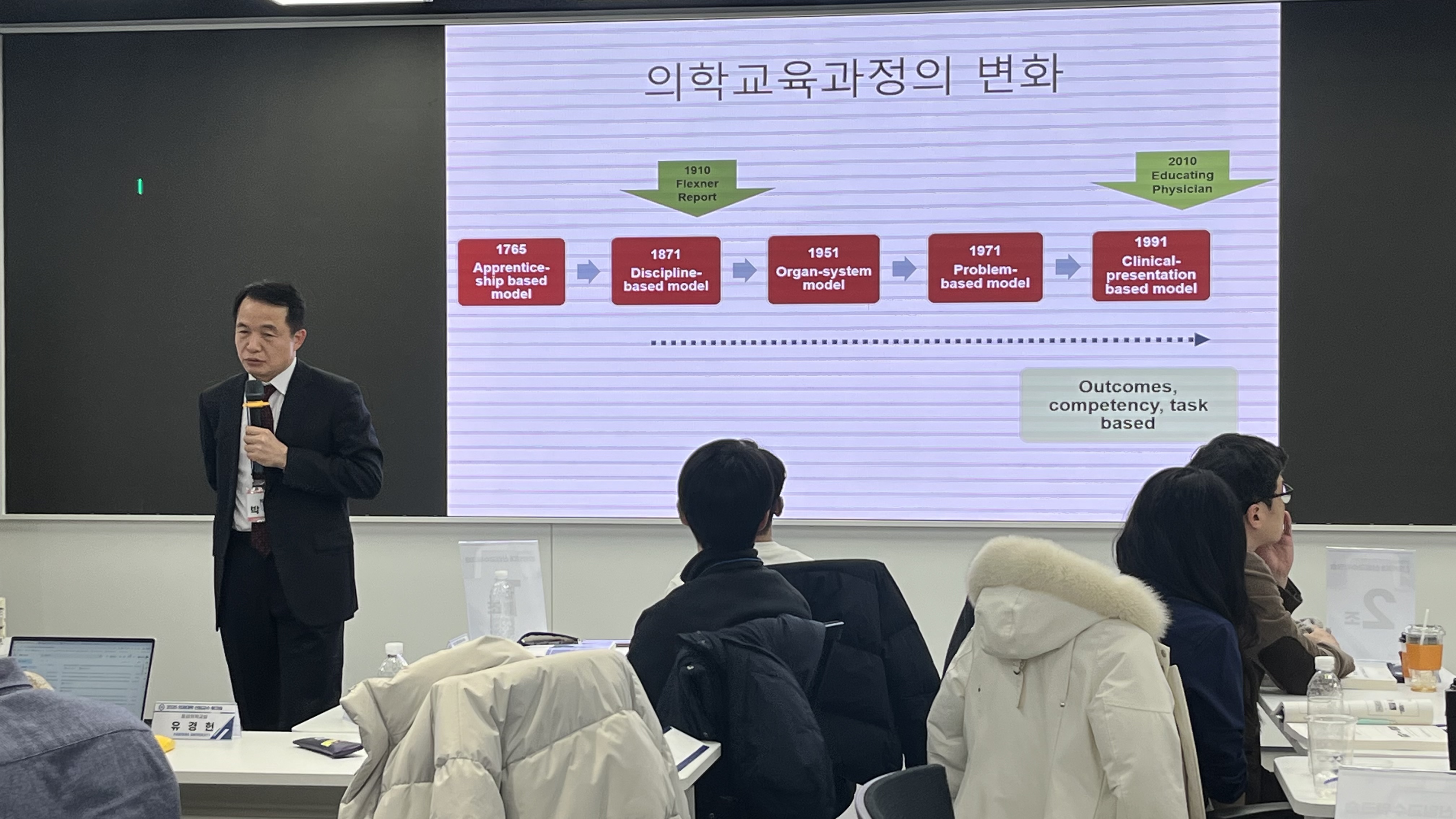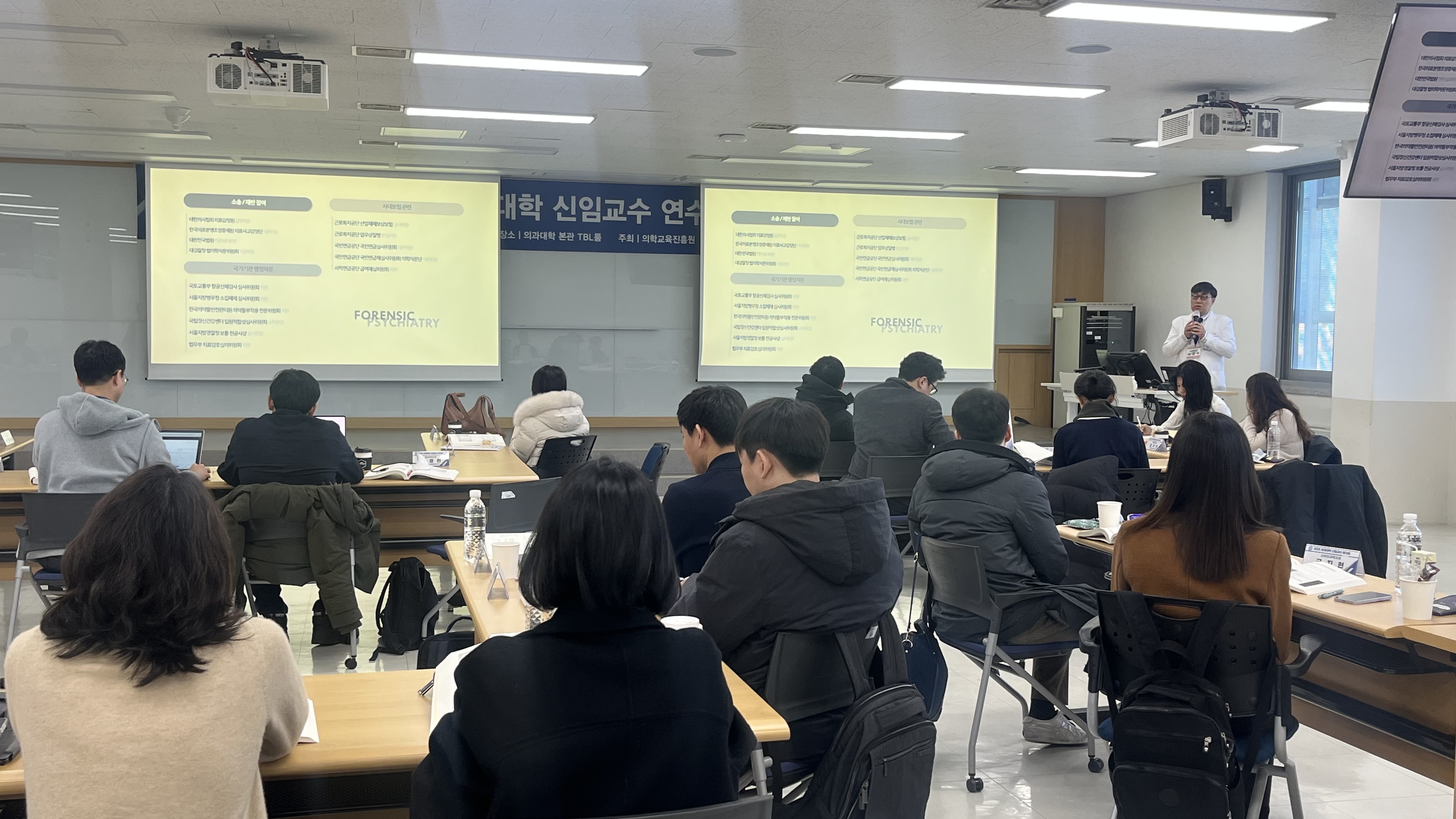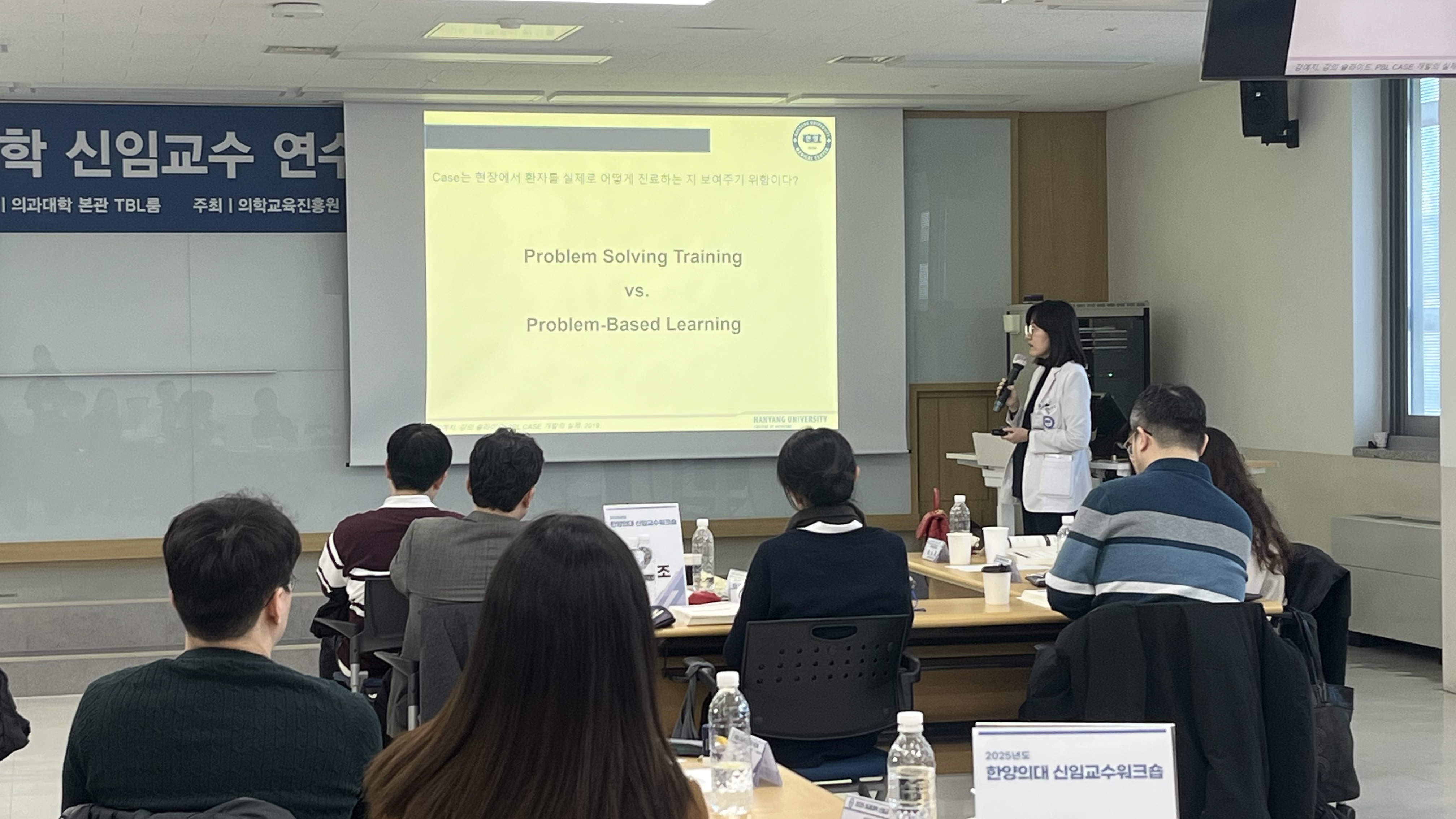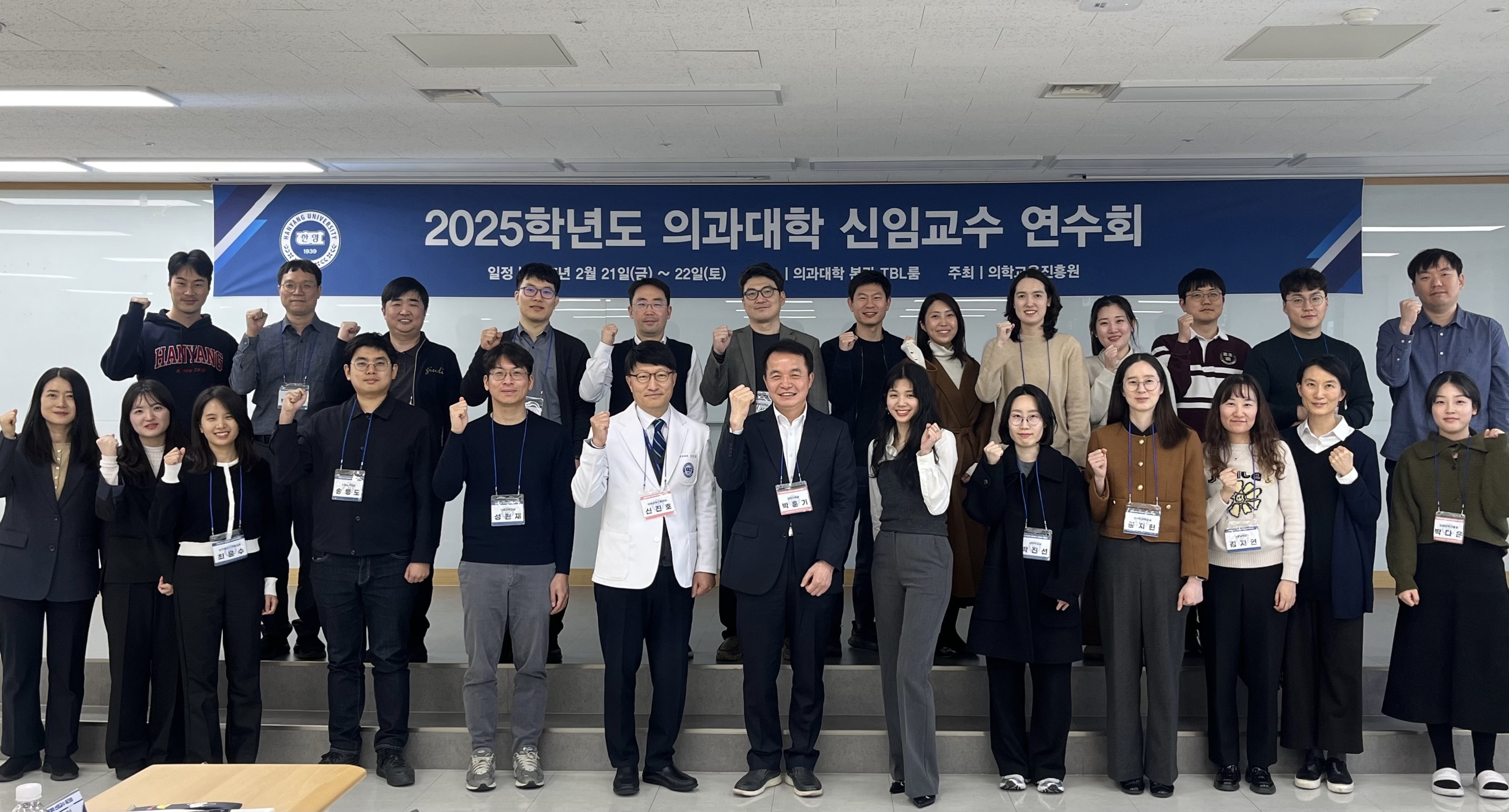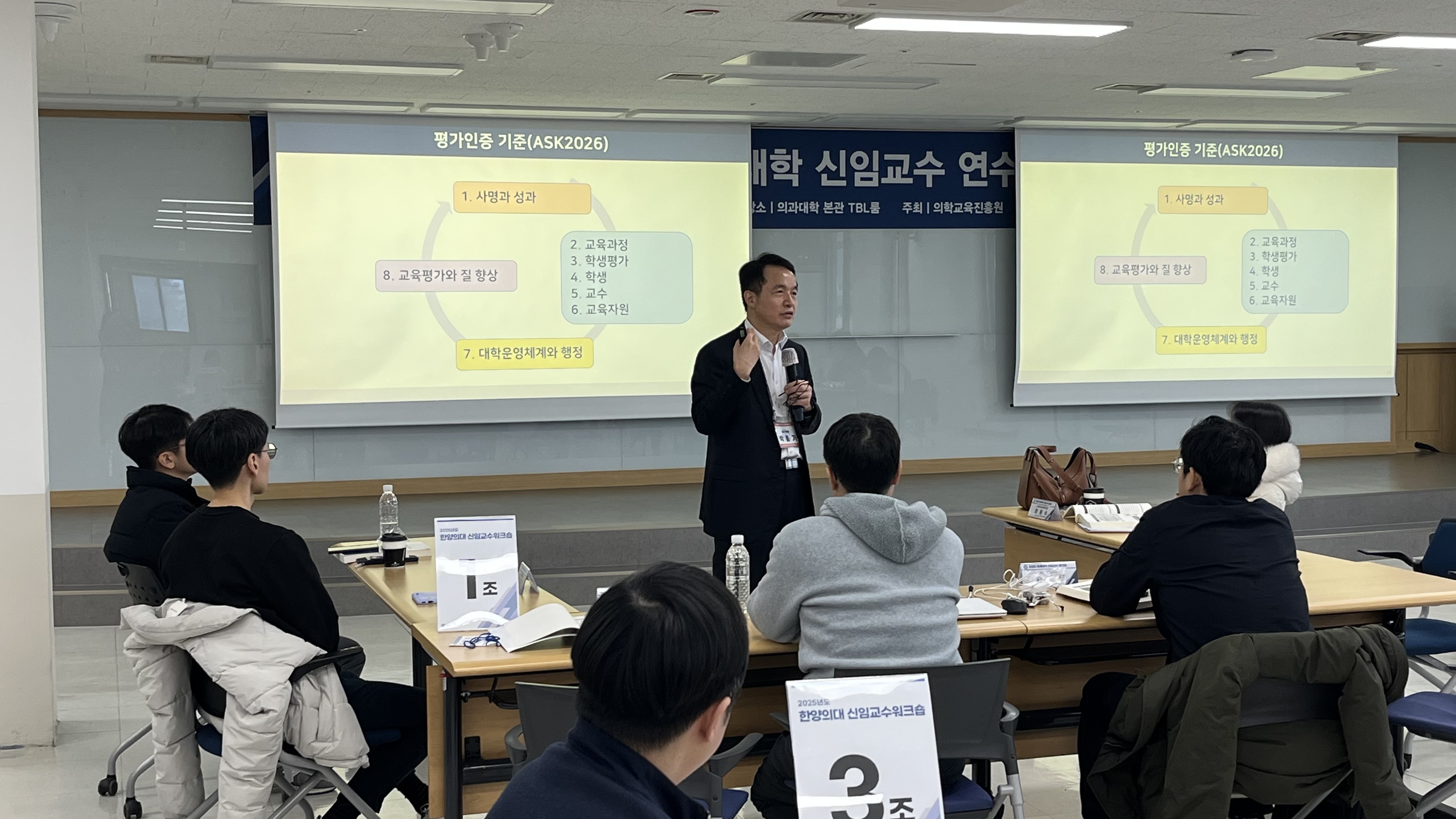 2025년 2월 21-22일 양일 간, 신임교수워크숍이 진행되었습니다. 이번 워크숍은 한양대학교 신본관 HEAT룸 및 의과대학 본관 TBL룸에서 진행되었으며, ‘한양의대 교육과정’, ‘우리 대학 행정 체계’, ‘의과대학 강의/임상실습’, ‘의과대학 교수의 커리어 개발’, ‘의과대학생 지도 상담의 이해’, ‘대학 본부’, ‘의학교육 평가인증’, ‘PBL 교육과정’ 등 교원에게 필요한 내용들로 구성되었습니다. 연자로는 박훈기(의과대학장, 가정의학교실), 신진호(의학교육진흥원장, 내과학교실) 교수가 진행과 강의를 맡았으며, 최중섭(대외협력처장, 산부인과학교실), 전대원(연구부학장, 내과학교실), 김유미(예방의학교실), 유상호(의료인문학교실), 나재윤(소아청소년과학교실), 이건석(정신건강의학교실), 신정훈(임상교육과장(구리), 내과학교실), 엄지은(내과학교실) 교수가 교육 경험을 공유해주시는 시간을 가졌습니다. 외부 연자로는 명예 교수 한중수 교수님(생화학‧분자생물학교실), 이효정 연구강사(아주대학교 의과대학 의학교육학교실) 께서 ‘의과대학 교수로서의 리더십’ 및 ‘계통강의 이해와 평가’라는 주제로 특강을 진행해주셨습니다. 그 밖에 윤호주(의무부총장, 내과학교실), 윤지희(교무부학장, 해부‧세포생물학교실), 이혜순(학생부학장, 내과학교실), 안병규(의학과장, 외과학교실), 배재만(MESH센터장, 산부인과학교실) 보직교수님께서 격려차 함께해주셨습니다.