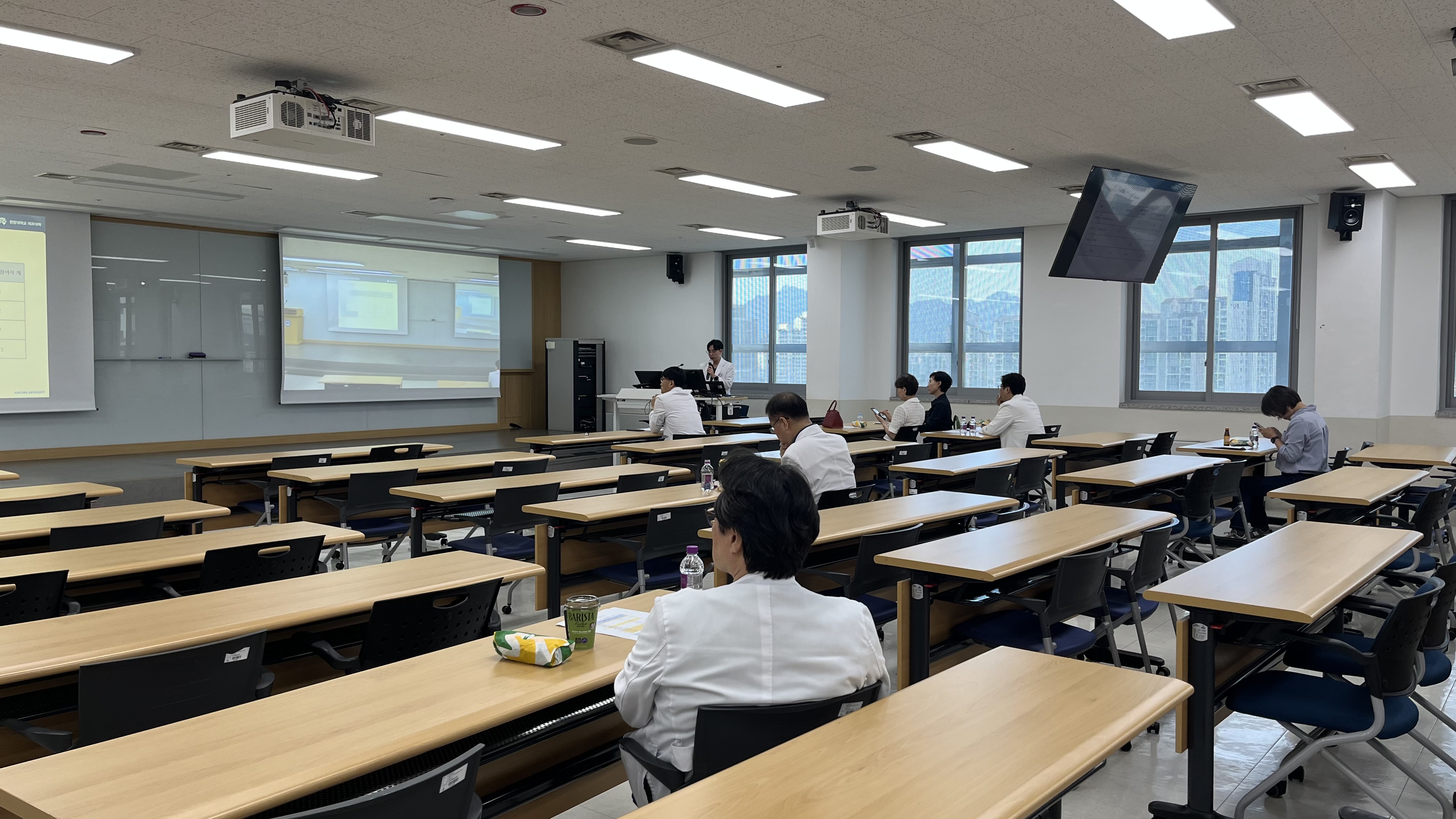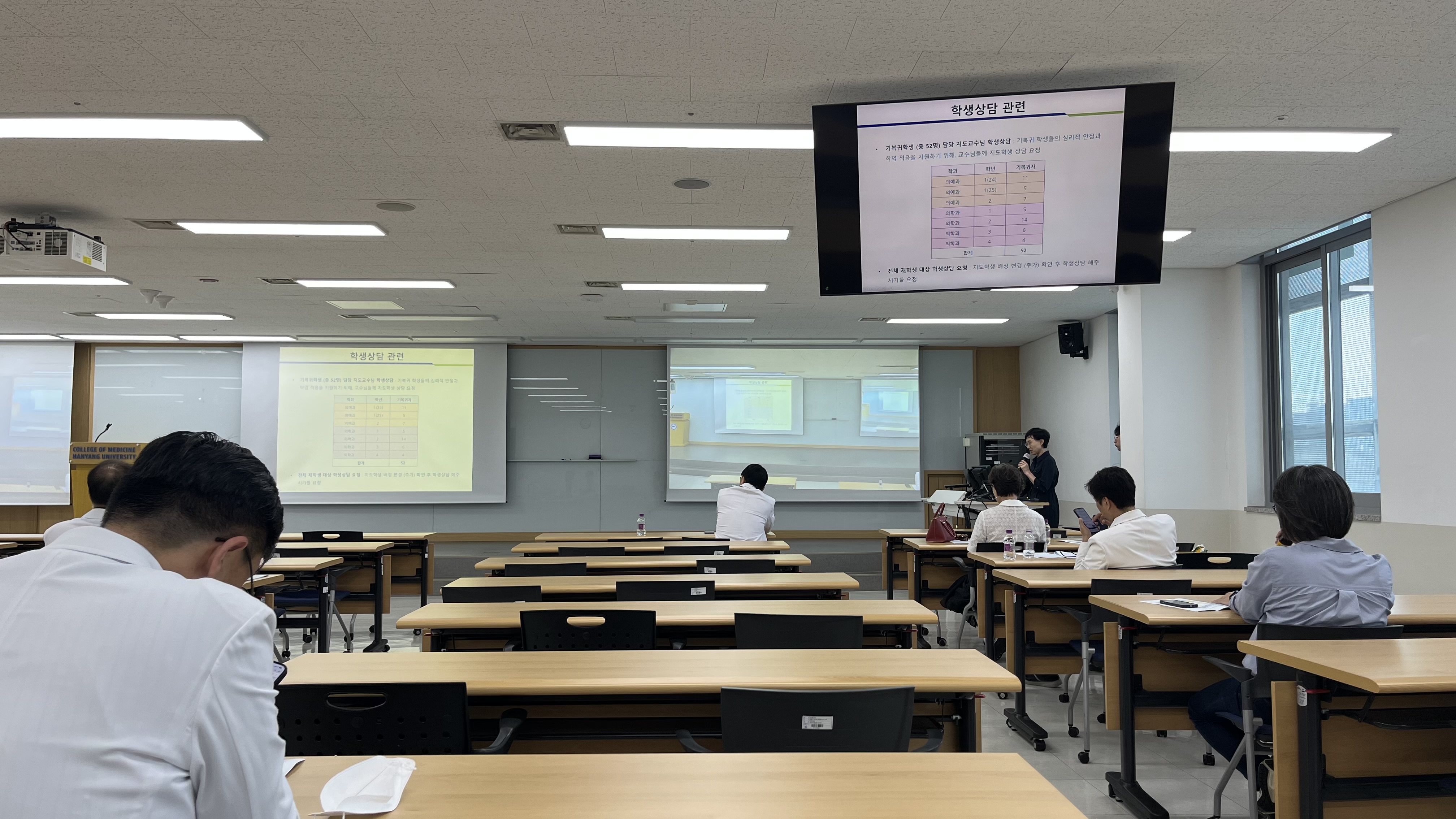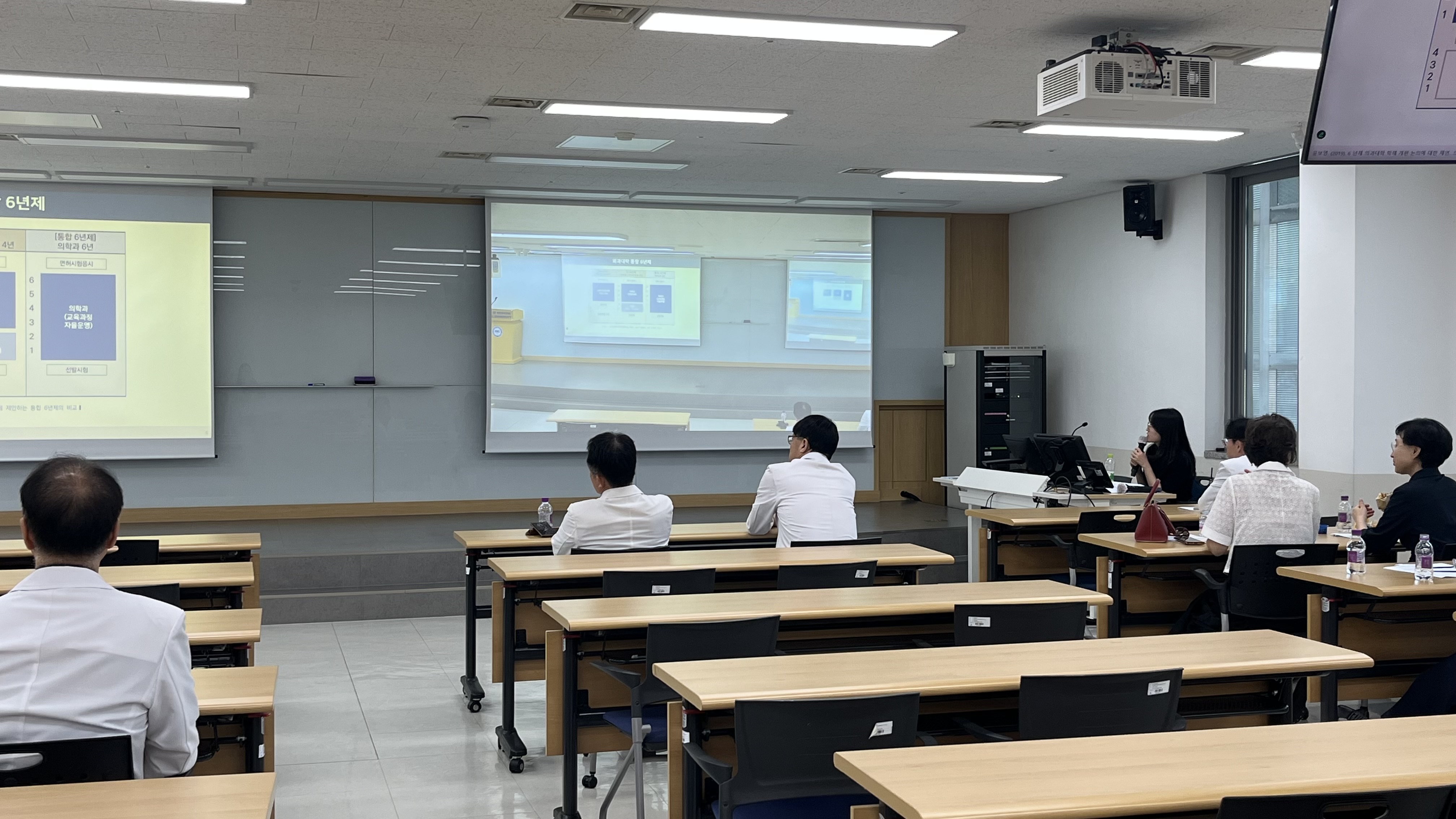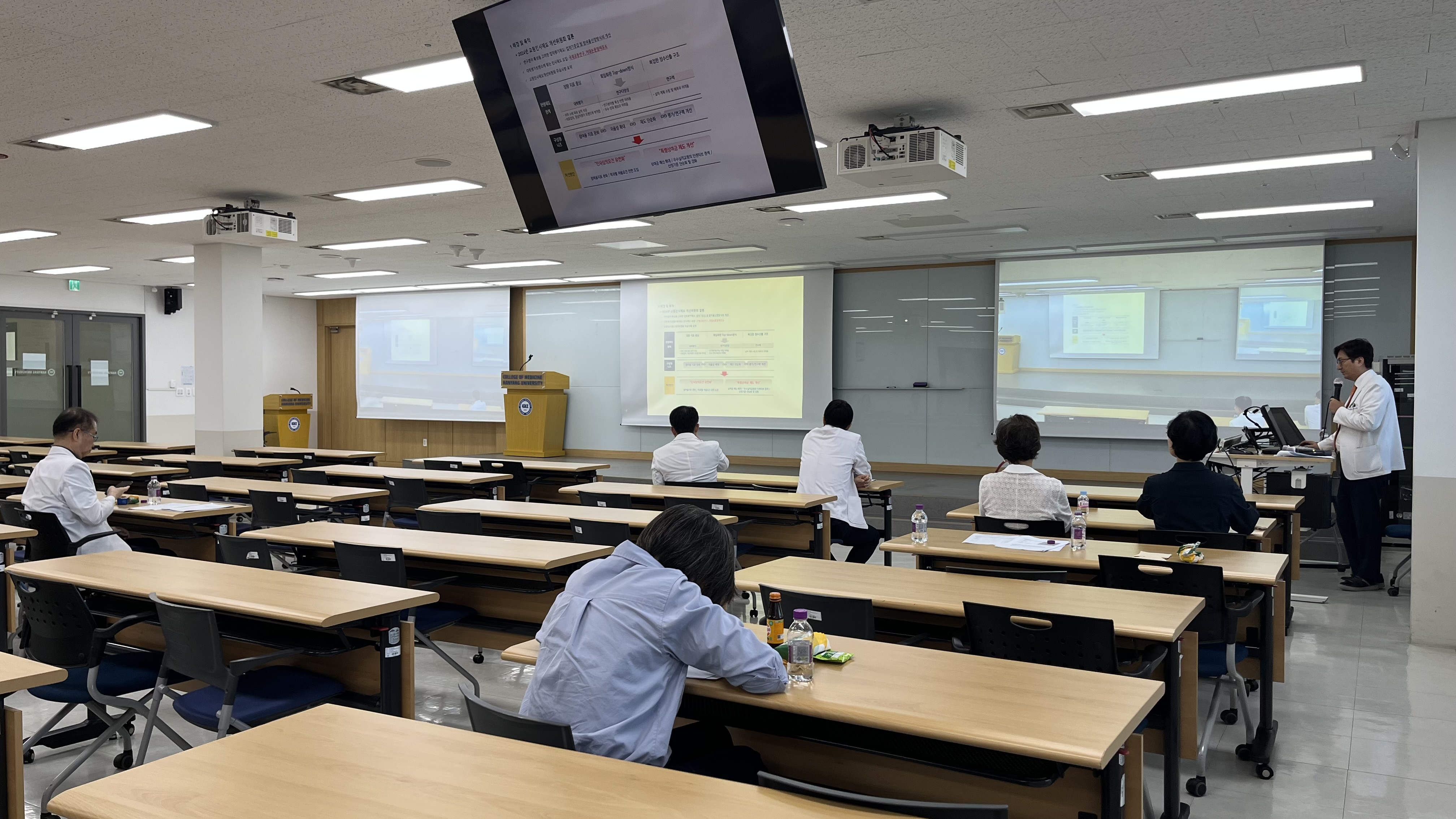 의학교육진흥원장 신진호 교수님께서 강의의 서막을 열어주셨으며, 연자로 모신 아주의대 의학교육학교실 이효정 연구강사께서는 '6년 통합교육과정과 학습목표관리의 중요성'에 대하여 성과 바탕 교육과정과 학습 성과, 학습 성과 및 학습목표 관리 방안 및 사례에 대해 강의해 주셨습니다. 'Top-Down 설계'와 'Bottom-up 실행'의 사례로 6년 전체의 교육과정을 한눈에 볼 수 있는 '지도'를 만드는 작업인 '교육과정 맵핑'과 개별 과정 성과 및 수업 목표 관리에 대해 상세하게 설명해 주셨습니다. 그밖에 학생 및 교육 관련 소위원회 과정평가 예시, 책임교수 총평 작성 예시, 장기계통 통합교육과정 시범 평가 등을 말씀해 주셨습니다.