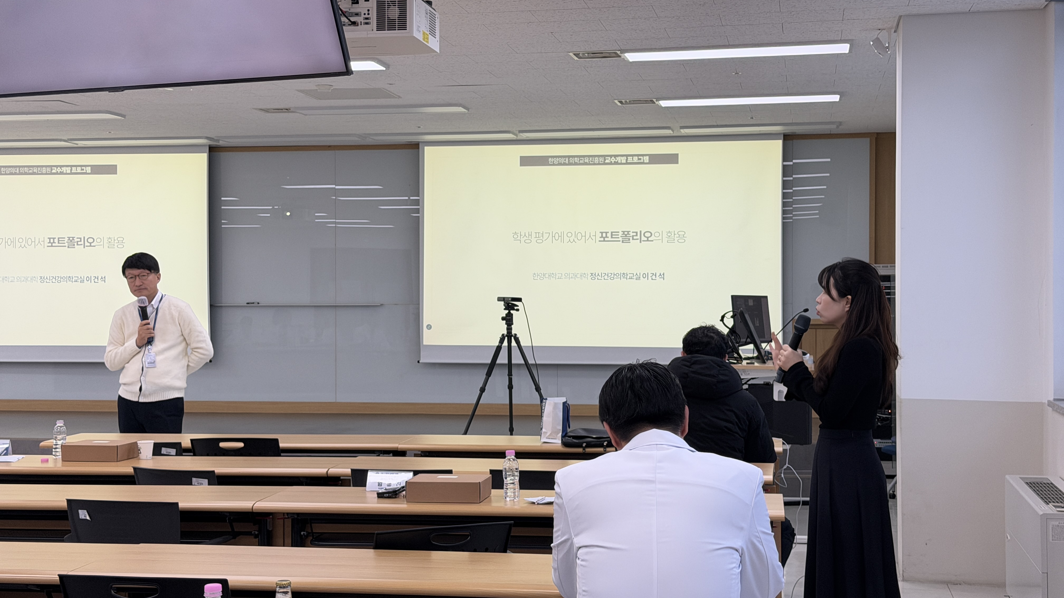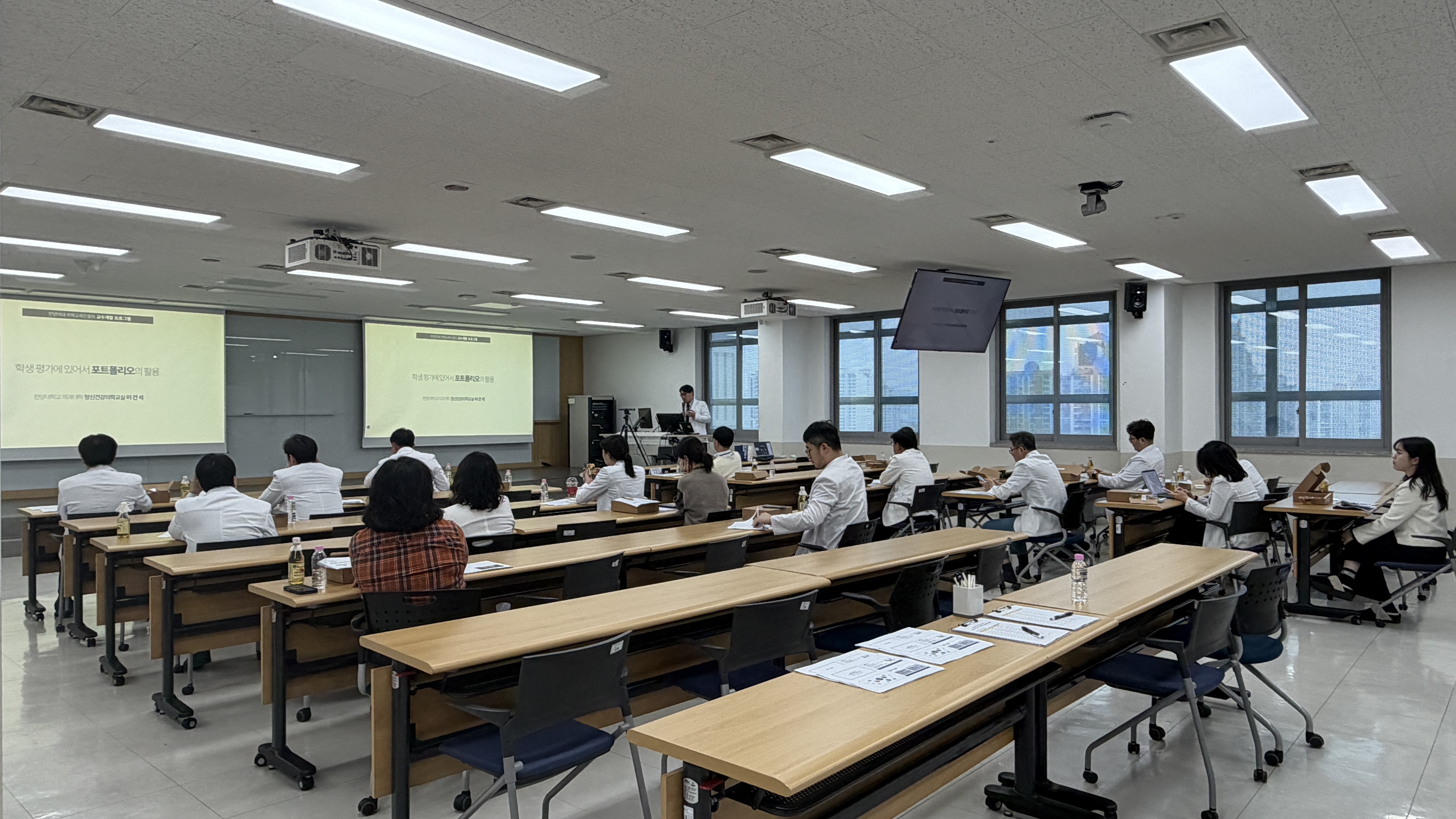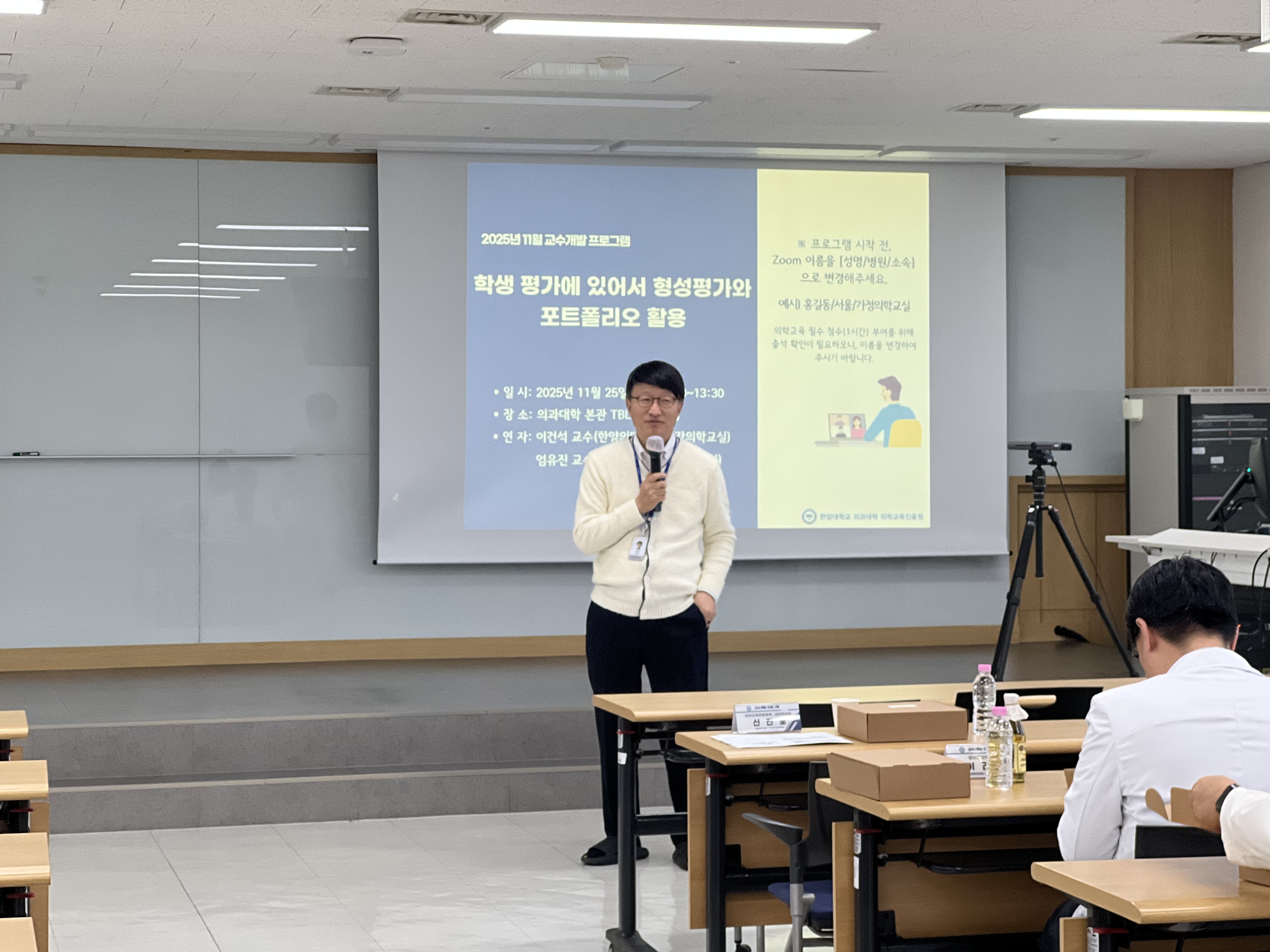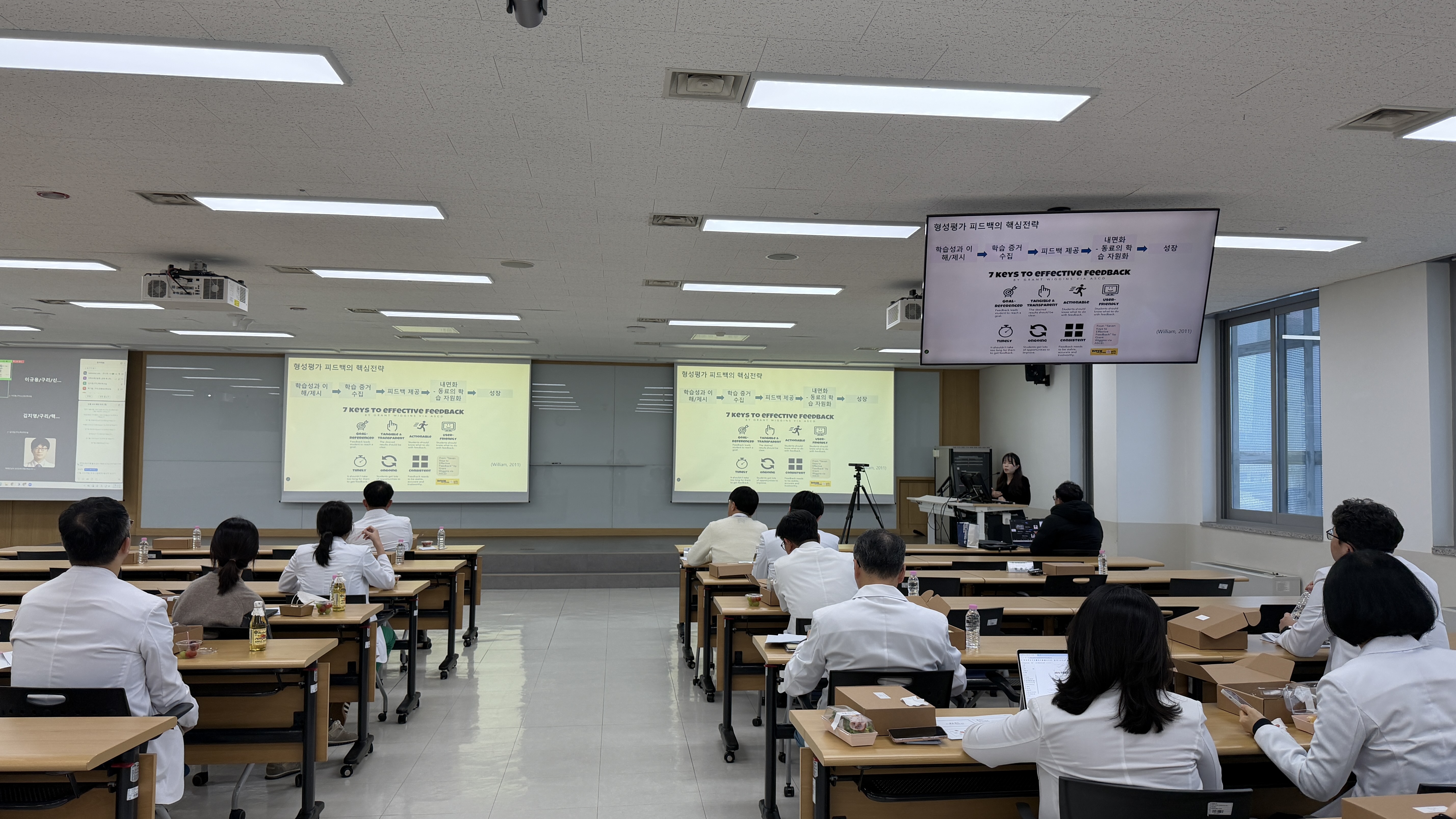 11월 교수개발 프로그램은 <학생 평가에 있어서 형성평가와 포트폴리오 활용>을 주제로 정신건강의학교실 이건석 교수님과 의학교육학교실 엄유진 교수님께서 강의를 진행해 주셨습니다. 이건석 교수님께서 포트폴리오의 개념부터 평가의 구현까지 다루어주셨으며, 엄유진 교수님께서 형성평가와 형성적 피드백의 구체적인 전략을 강연해주셨습니다. 강의 이후에는 질의응답을 통해 심도 있는 토론을 나눴습니다. 본 프로그램에는 약 23명의 교수님께서 대면 및 비대면으로 교육에 참여해 주셨습니다.