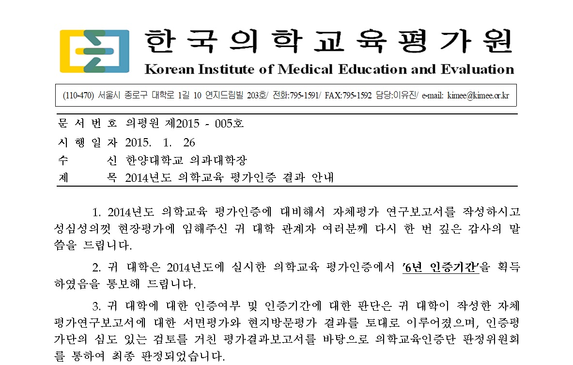 한양대학교 의과대학 평가인증 6년 인증 Hit 7186