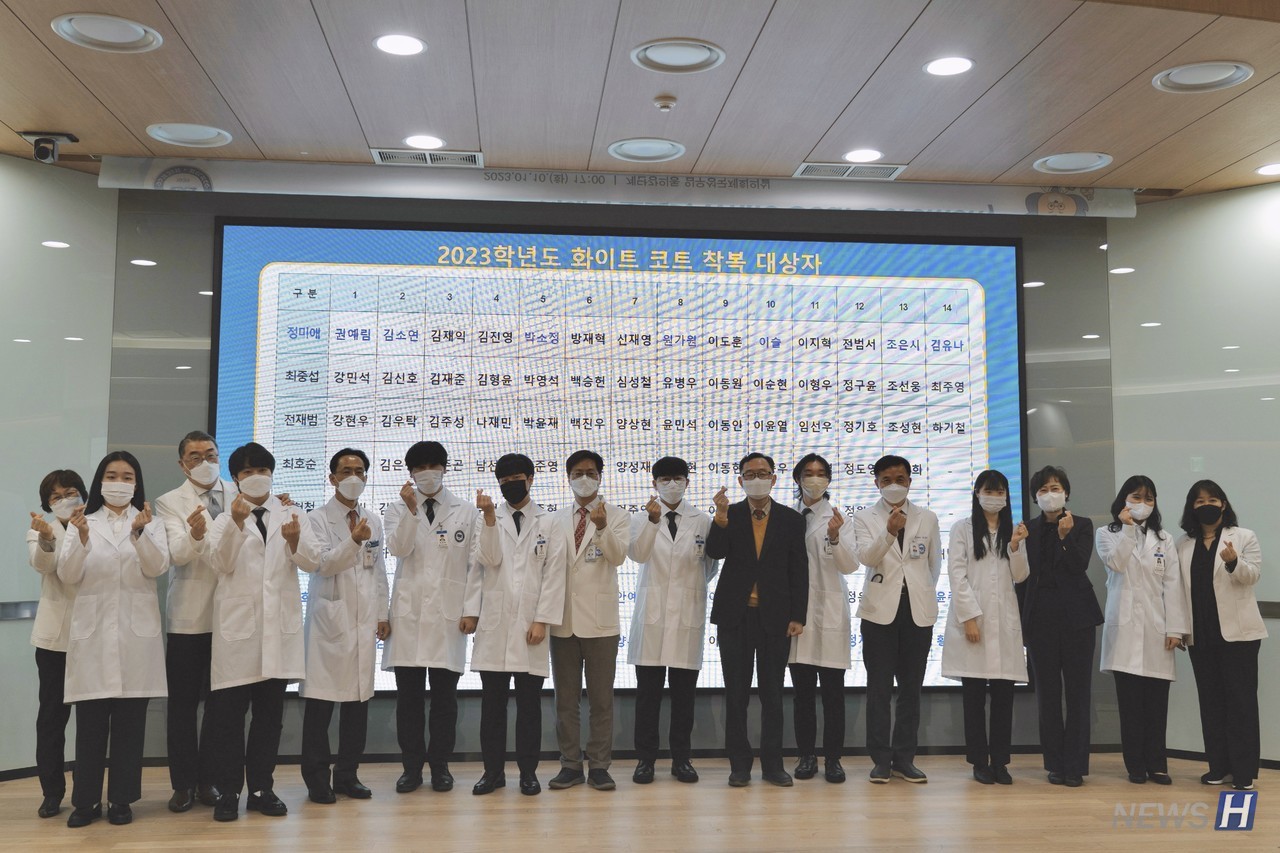 ▲ 의사의 상징이자, 의료원의 일원으로서 임상을 시작한다는 의미를 담고 있는 순백색의 가운을 교수들이 직접 학생들에게 입혀주고 있다.▲ 한양대 의대 동문교수회가 지원한 화이트코트와 명찰을 착용한 학생들의 모습.
