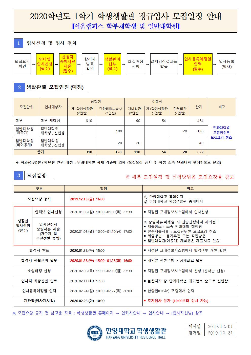 2020-1학기 학생생활관 정규입사 모집에 대한 안내를 공지하오니