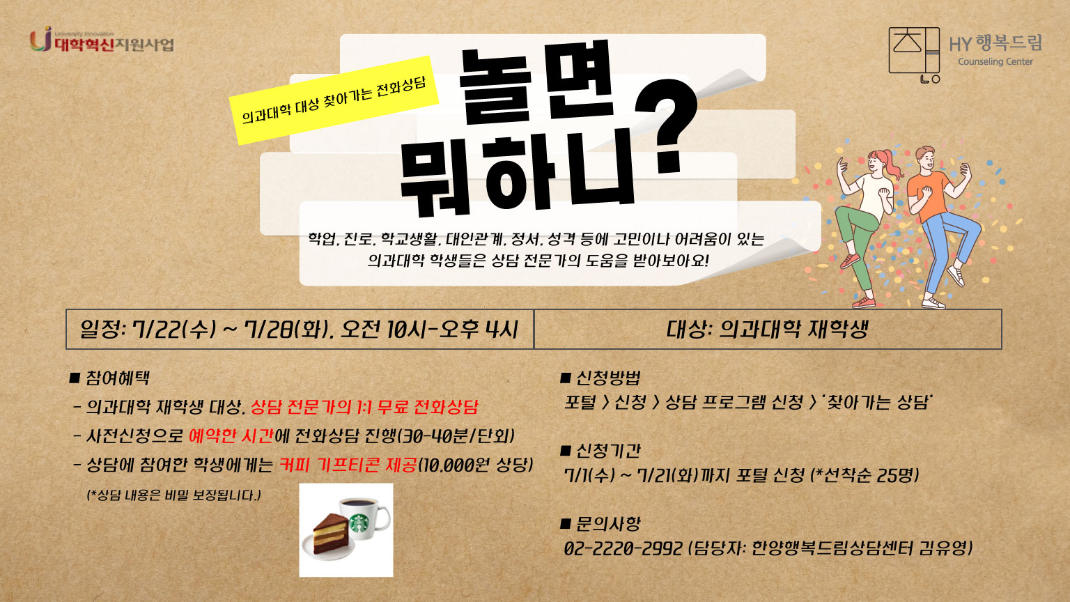 위와 같이 의과대학 재학생 대상 <찾아가는 전화상담> 프로그램을 진행할 예정이오니 관심있는 학생들의 많은 신청 바랍니다.