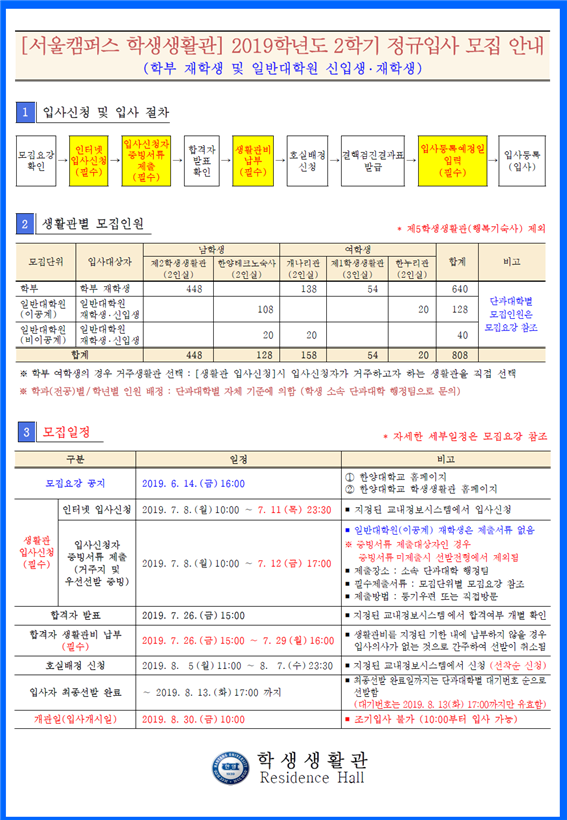 2019-2학기 학생생활관 정규입사 모집에 대한 안내를 공지하오니