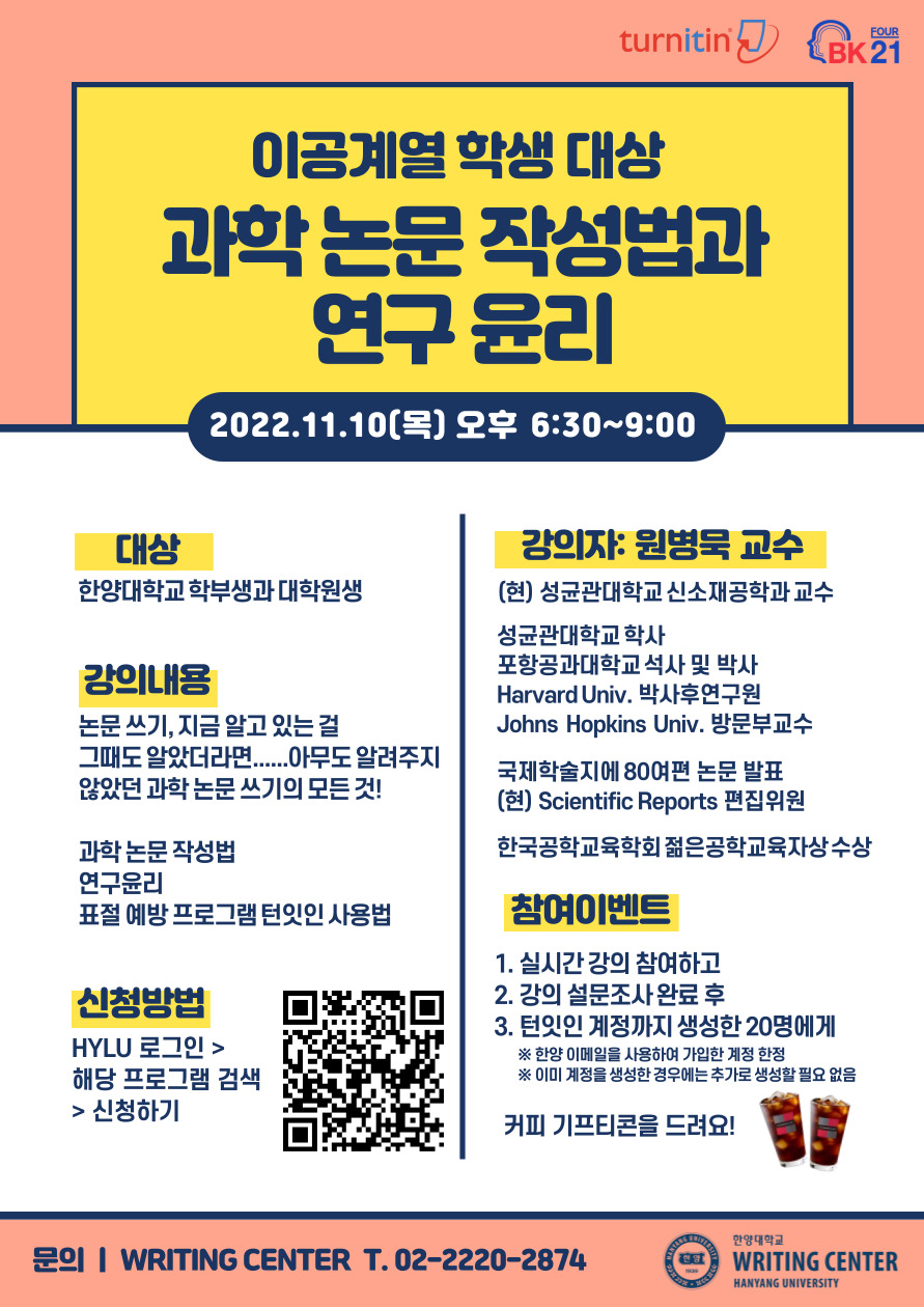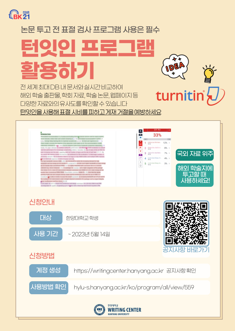 [WRITING CENTER] 논문 표절 예방 프로그램 턴잇인 안내 및 관련 교육 홍보 요청 Hit 7878