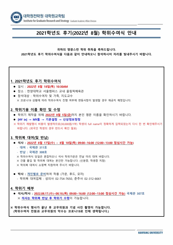 2021학년도 후기(2022년 8월) 학위수여식 안내			Hit 3684