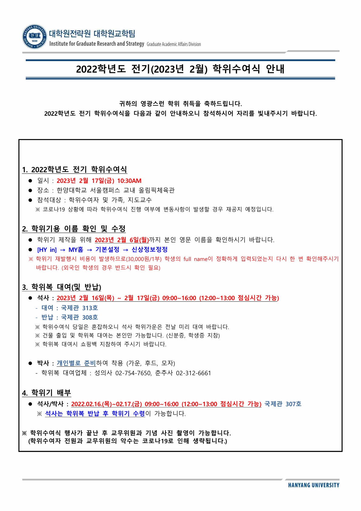 2022학년도 전기(2023년 2월) 학위수여식 안내 Hit 5259