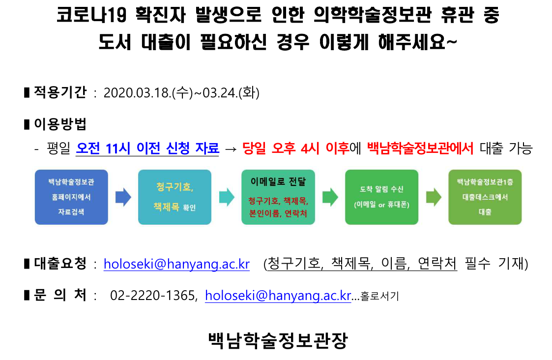 [백남학술정보관]의학학술정보관 휴관기관 중 도서대출서비스 안내 Hit 6264