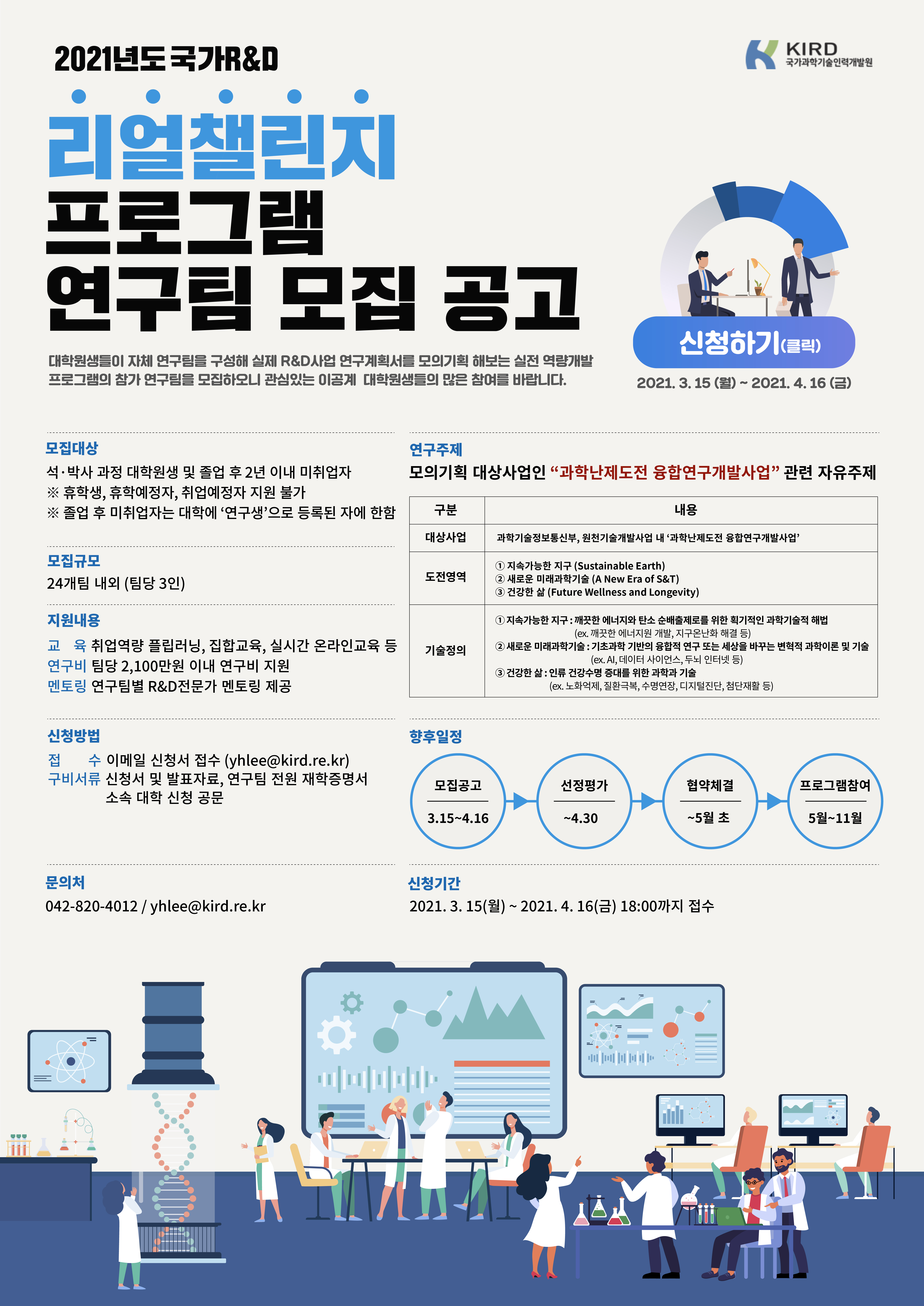1. 국가과학기술인력개발원은 과학기술정보통신부 산하 전문 교육기관으로 이공계 석?박사 대학원생의 실전 역량 향상을 위해 실제 R&D사업 연구과제를 모의기획하는「국가R&D 리얼챌린지 프로그램」을 추진하고 있습니다.