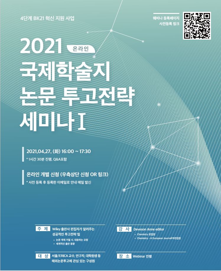 백남학술정보관에서는 4단계 BK21 대학원 혁신지원사업으로 ‘국제학술지 논문투고 전략세미나’를 온라인으로 개최할 예정입니다. 관심 있는 분들의 많은 참여 바랍니다.