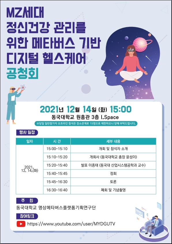 동국대학교 명상메타버스플랫폼기획연구단에서는 MZ세대 정신건강 관리를 위한 메타버스 기반 디지털 헬스케어를 구축하기 위해 ‘상향식 다부처공동기획연구’를 추진하고 있습니다.