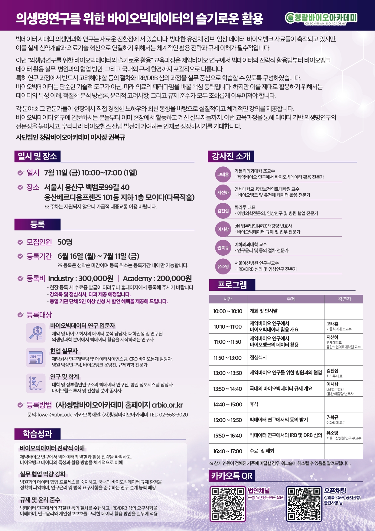 (사)청람바이오아카데미에서 [의생명연구를 위한 바이오빅데이터의 활용] 워크숍을 개최합니다.
