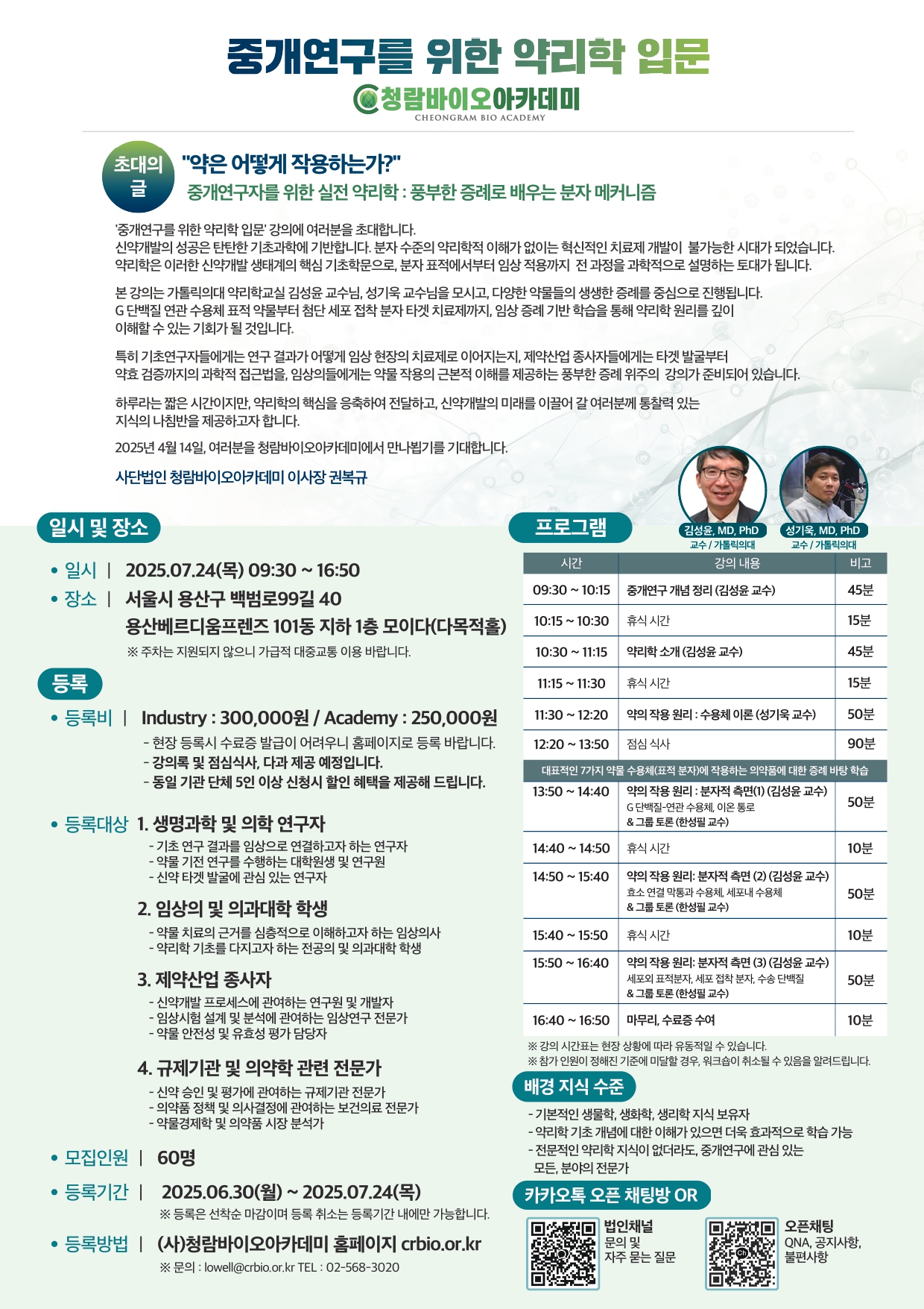 (사)청람바이오아카데미에서 [중개연구를 위한 약리학 입문] 교육을 개최합니다.