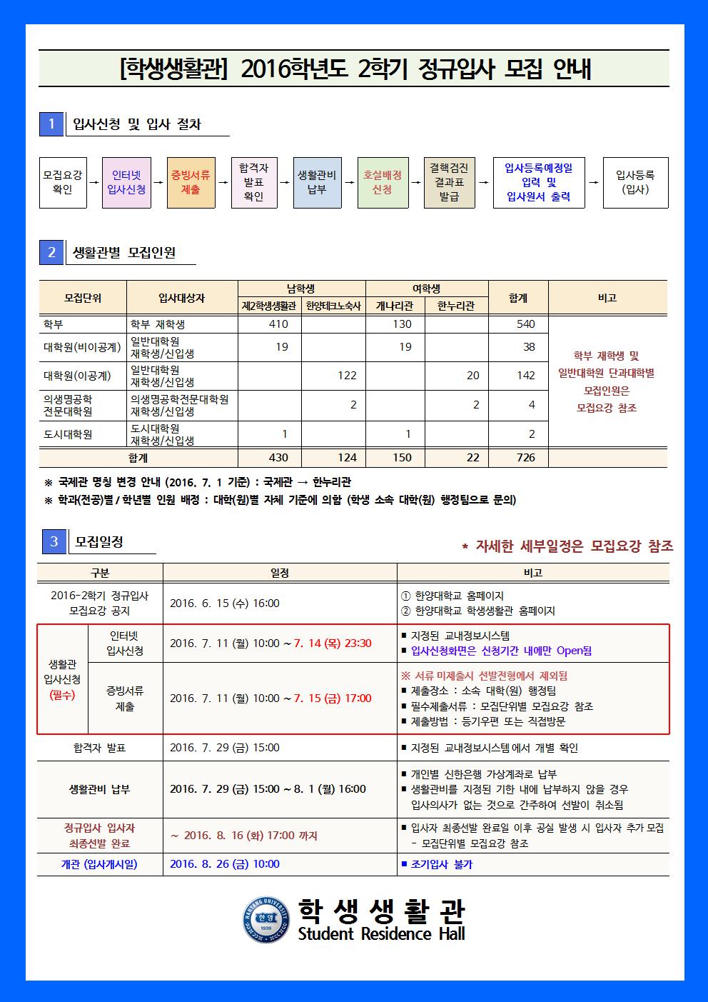 2016-2학기 학생생활관 정규입사 모집 안내 - 의학전문대학원 재학생 제외 Hit 10834