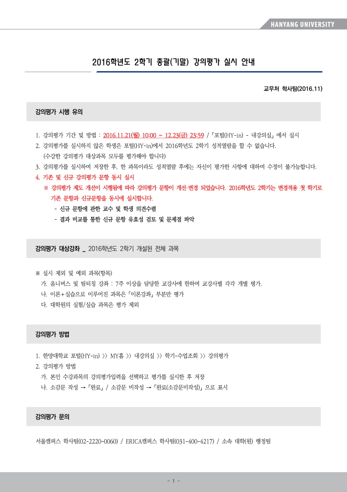 2016-2학기 총괄(기말) 강의평가 실시안내 Hit 10625