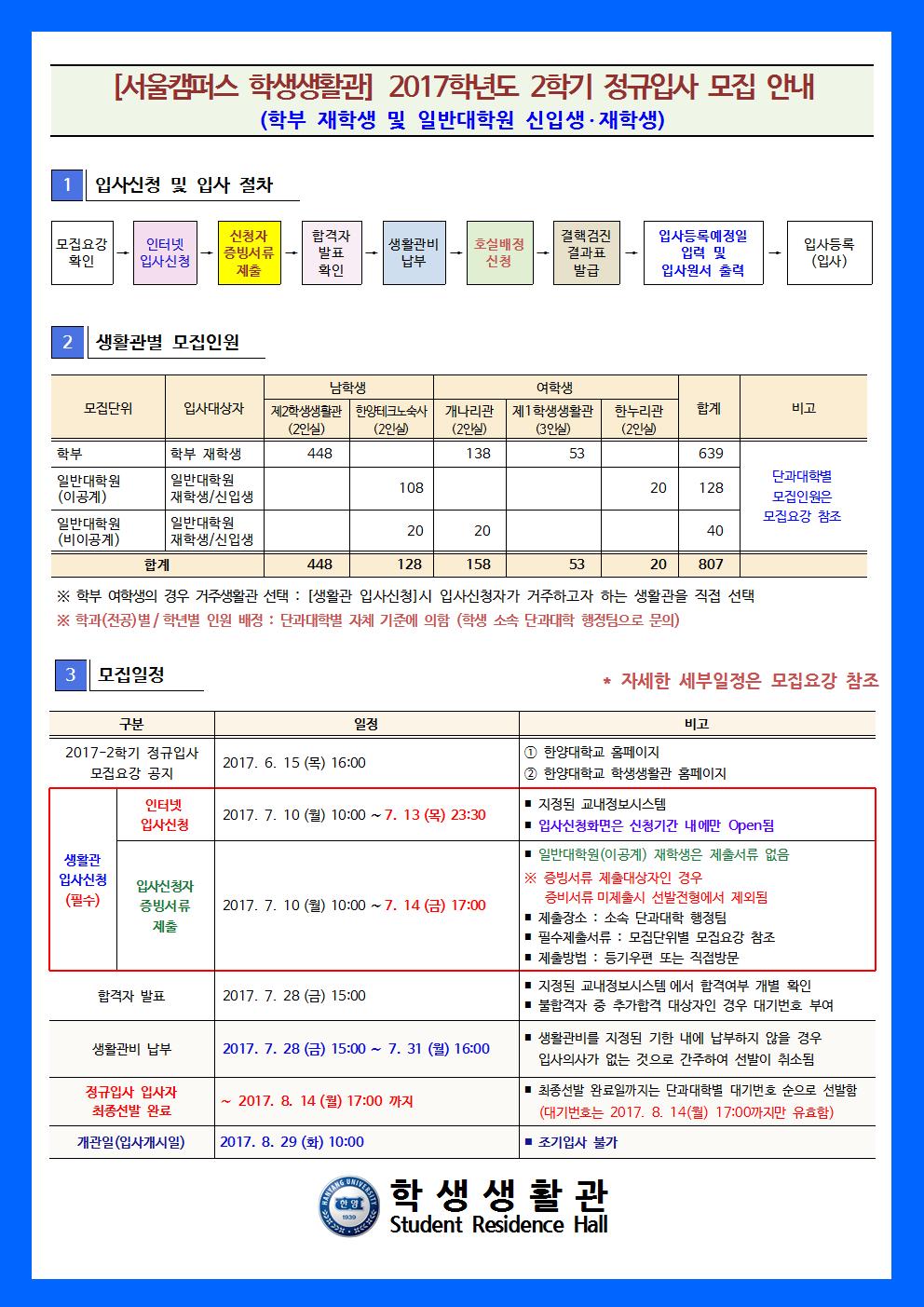 2017-2학기 학생생활관 정규입사 모집에 대한 안내를 공지하오니