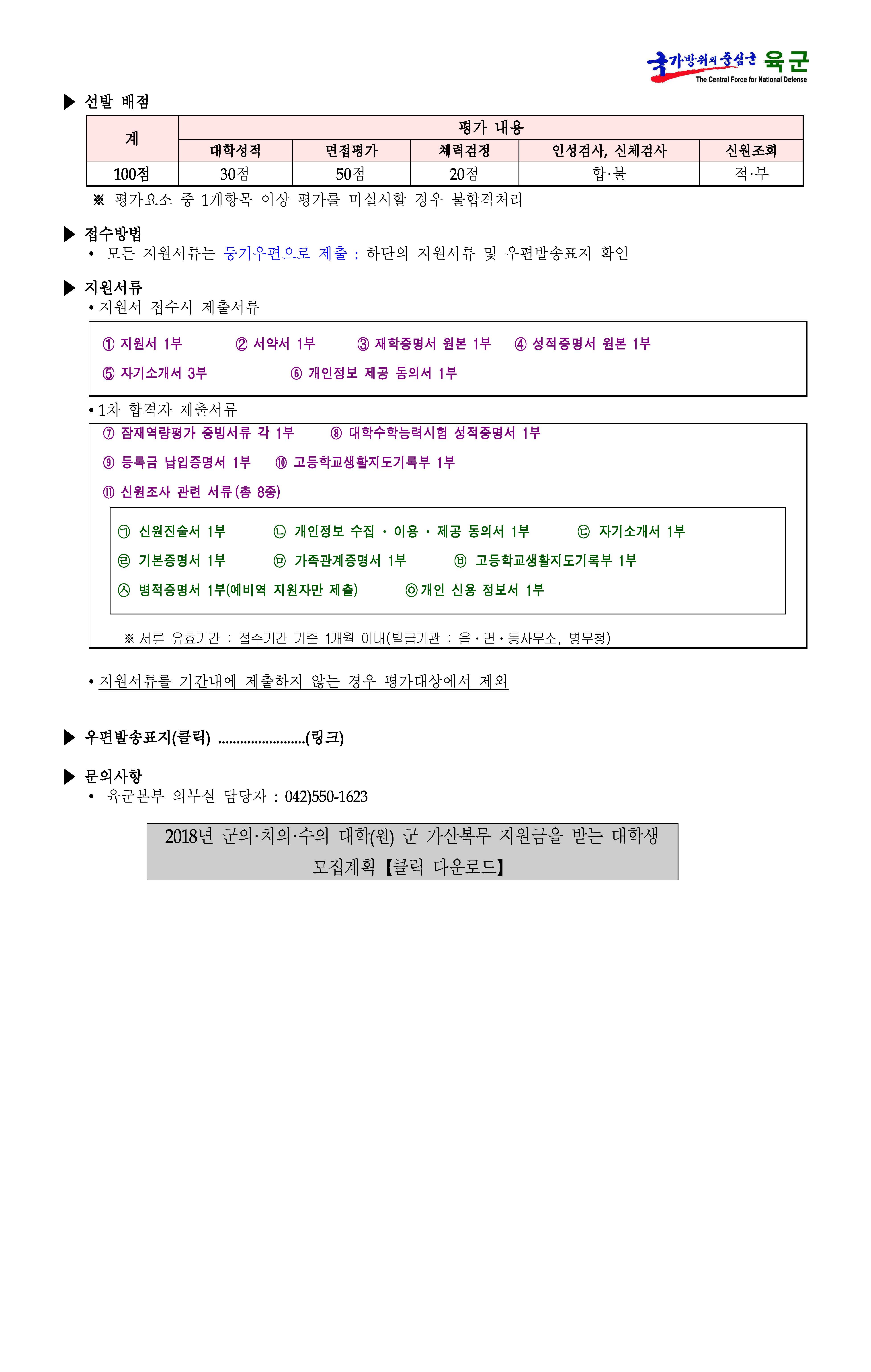 - 18년 군의치의수의 군 가산복무 지원금을 받는 대학(원)생 모집요강.pdf 663.7KB Hit 1861