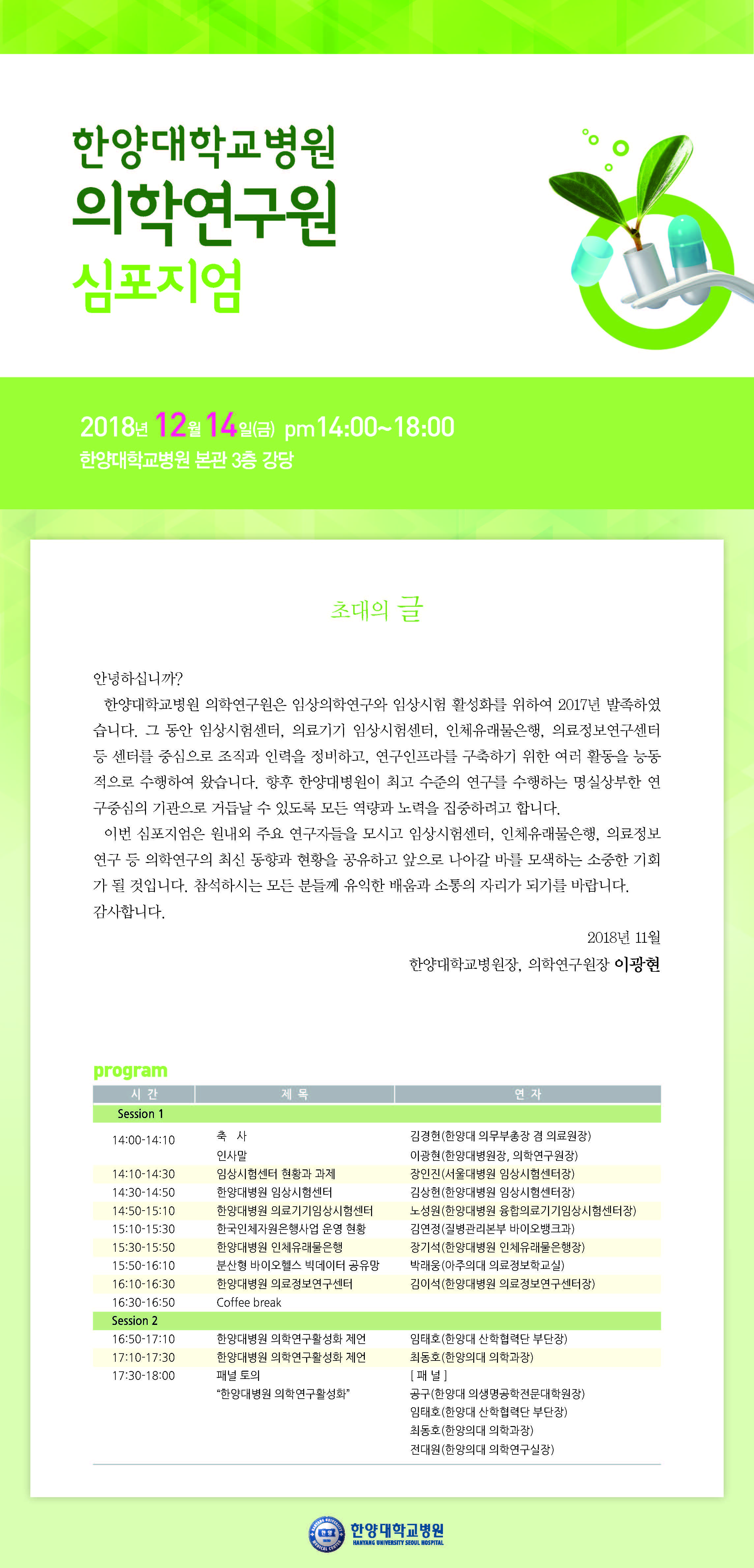 한양대학교병원 의학연구원 심포지움 개최 안내