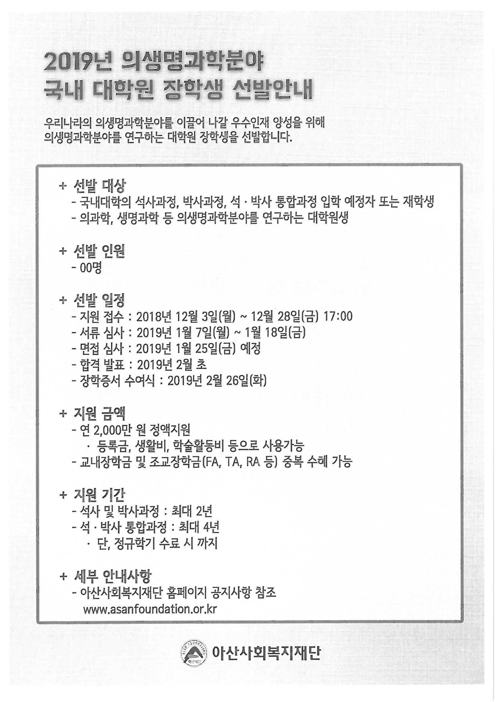 [아산사회복지재단]2019년 의생명과학분야 대학원 장학생 선발 안내