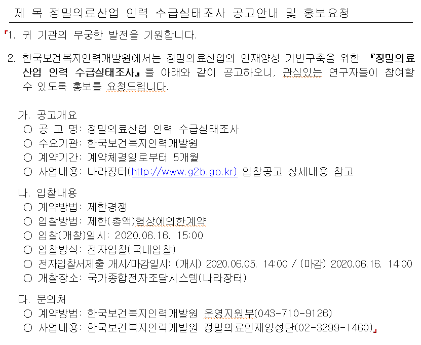 - 1. 입찰공고서(정밀의료산업 인력 수급실태조사).hwp 53.2KB Hit 355