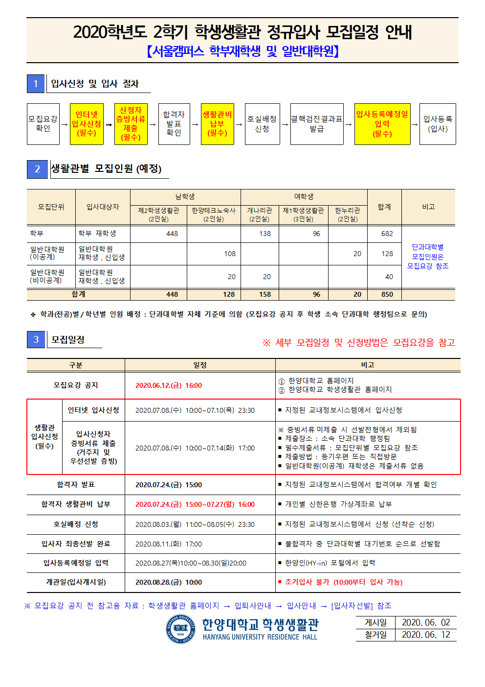 2020-2학기 학생생활관 정규입사 모집에 대한 안내를 공지하오니