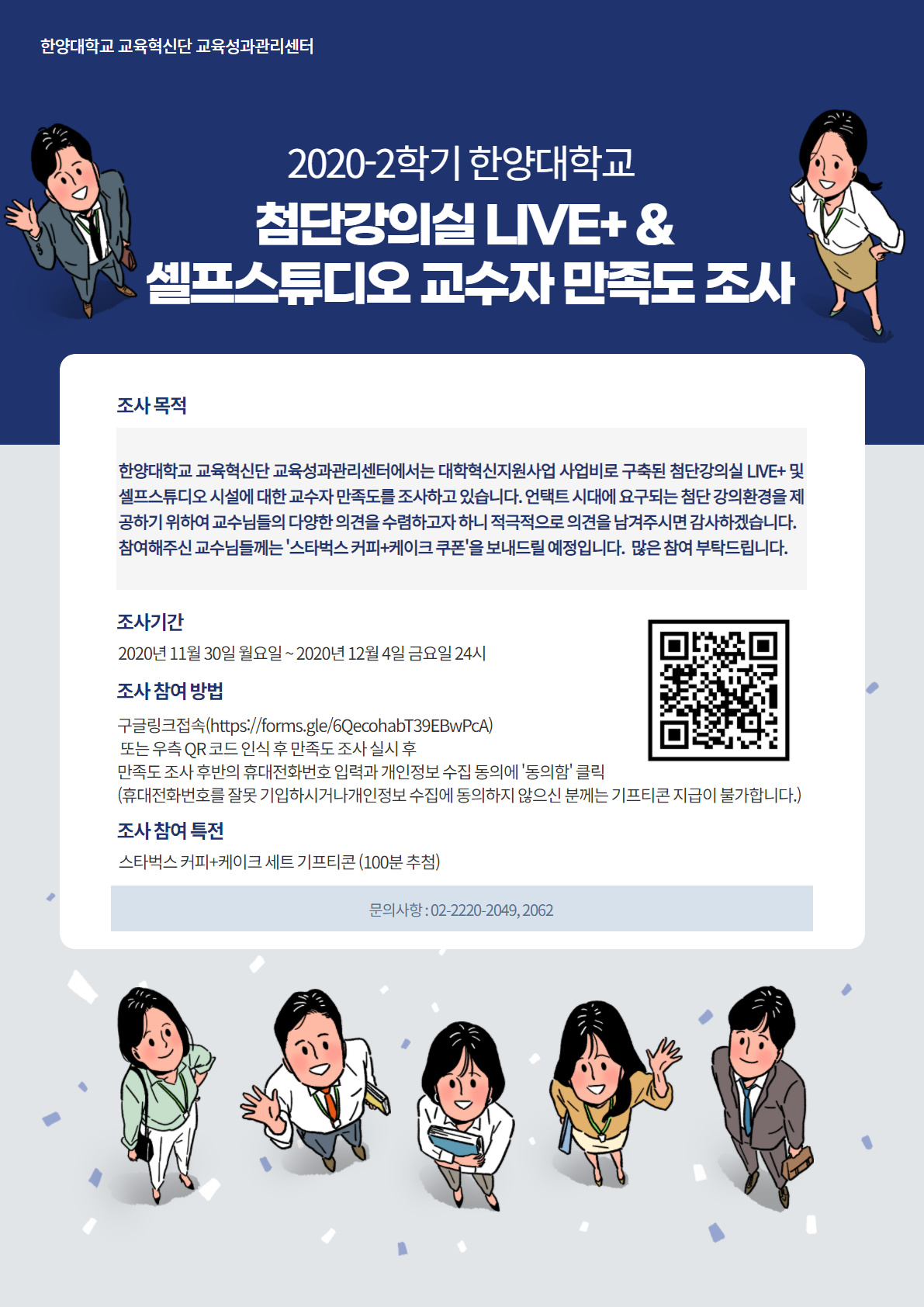 - 한양대학교 교육성과관리센터에서는 첨단강의실 LIVE+ 및 셀프스튜디오 시설에 대한 교수자 만족도 조사를 실시하고 있습니다. 추첨을 통하여 100분께 스타벅스 커피+케익 쿠폰을 드릴예정이니 많은 참여 부탁드립니다. -