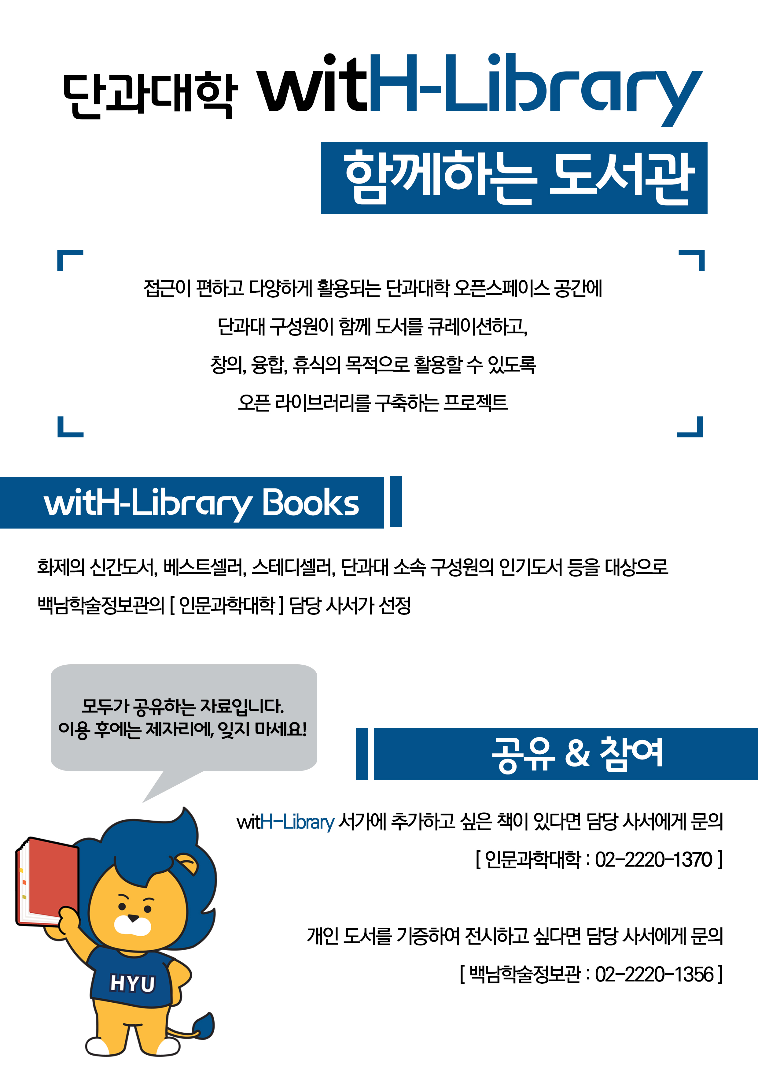 백남학술정보관에서는 각 단과대학의 오픈 스페이스 공간을 활용하여 단과대 구성원이 함께 참여하고 만들어 나가는 "witH-Library(함께하는 도서관)" 구축 프로젝트를 진행하고 있습니다. 참여를 희망하는 단과대학은 아래의 내용을 확인하시고 신청하시기 바랍니다.