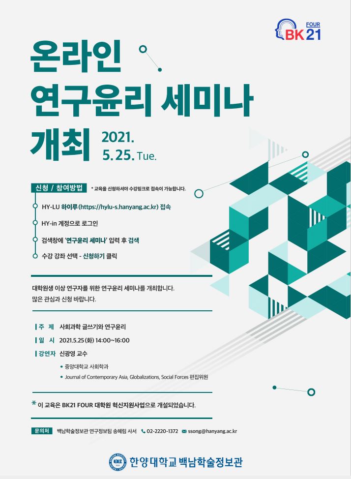 백남학술정보관에서는 BK21 대학원 혁신지원사업의 일환으로 「제2회 연구윤리 세미나」를 온라인으로 개최할 예정입니다. 관심 있는 분들의 많은 참여 부탁드립니다.