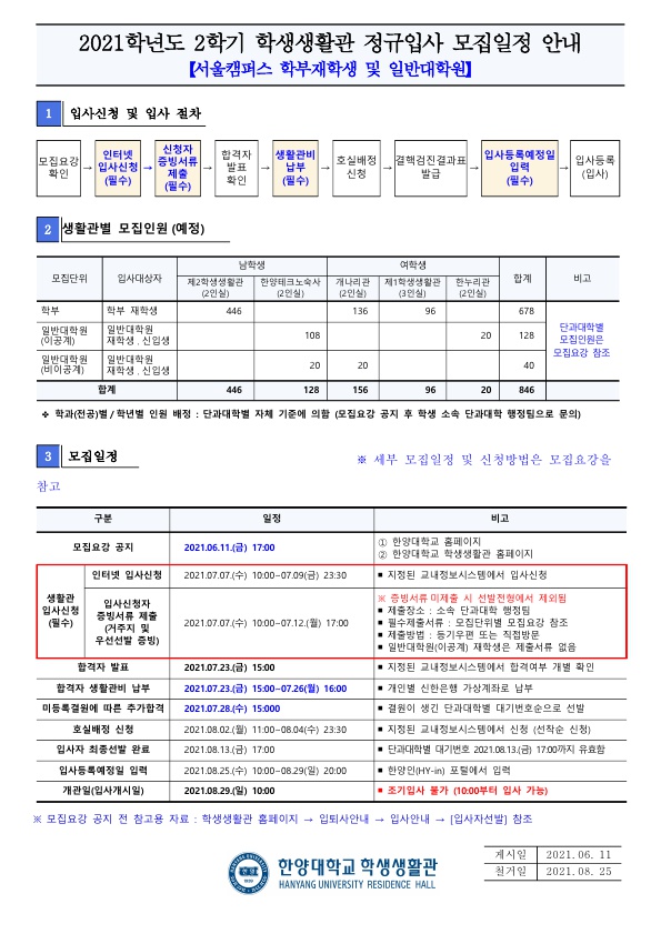 학생생활관 2021학년도 2학기 정규입사 입사자 선발안내 Hit 5196