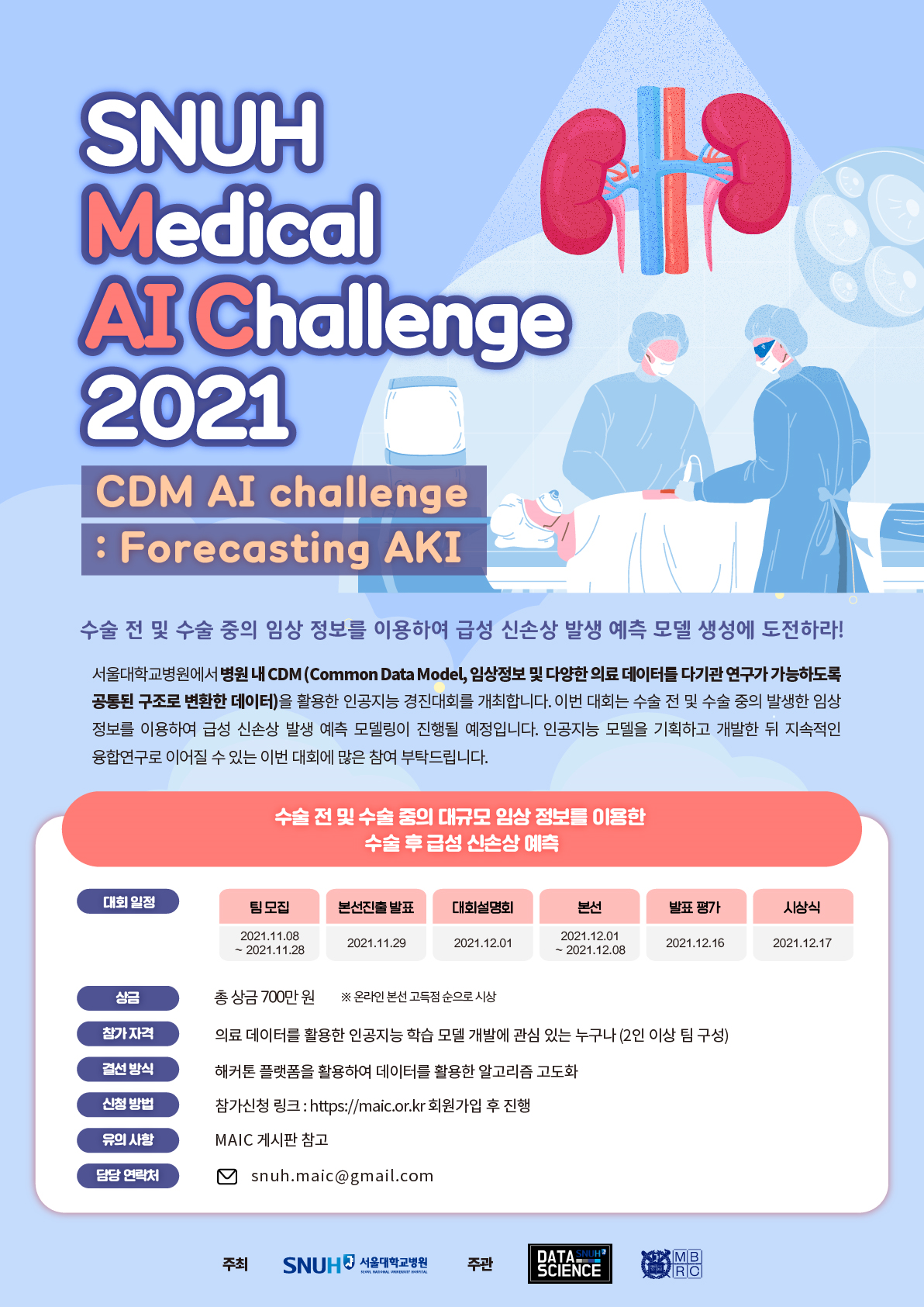 CDM AI Challenge: Forecasting AKI (참가신청 ~11/28) 의 참가팀을 모집 중에 있습니다.