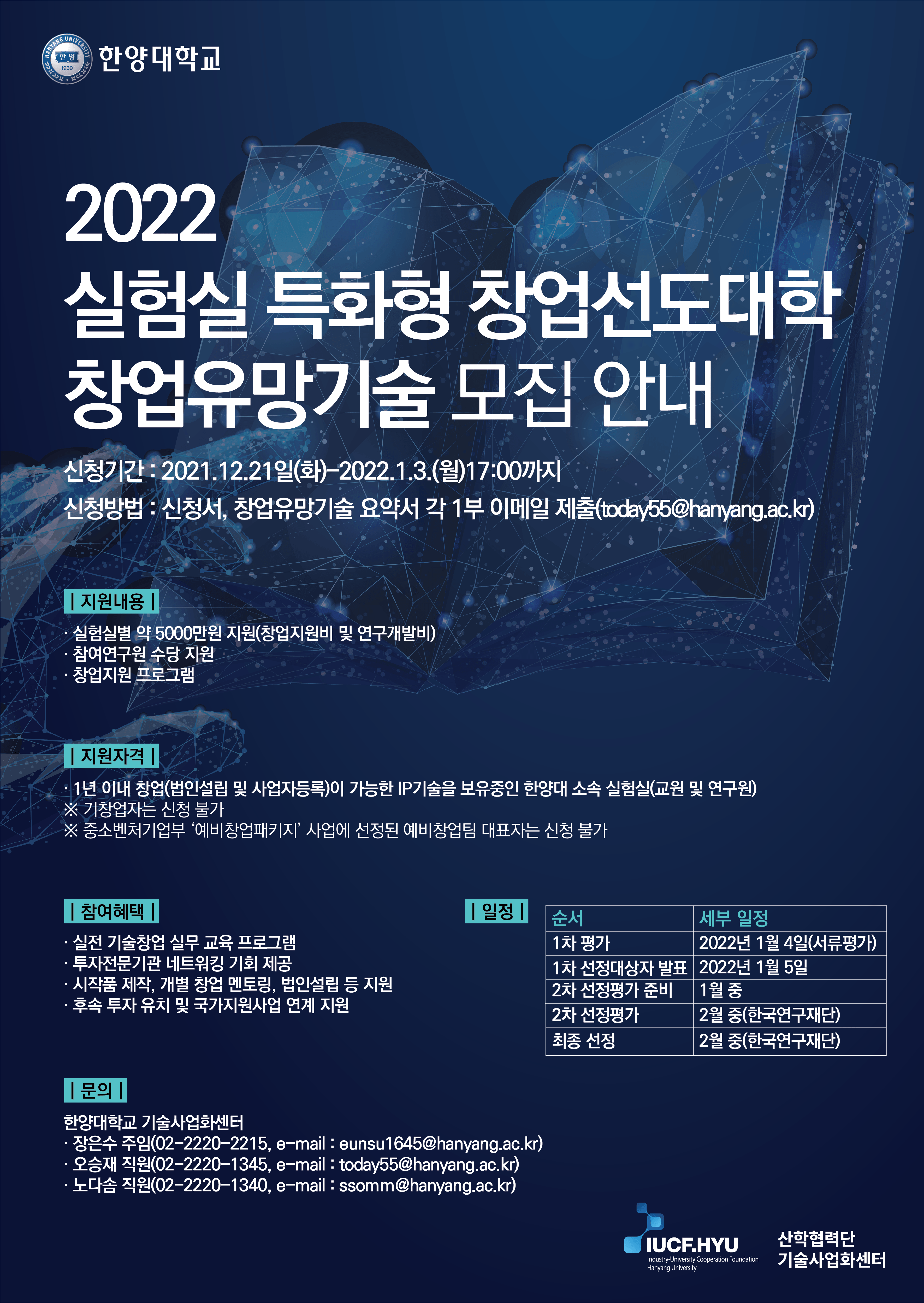 1. 산학협력단 기술사업화센터에서는 2022년도 실험실 특화형 창업선도대학사업에 참여할 창업유망기술을 선정하고자 다음과 같이 모집합니다.
