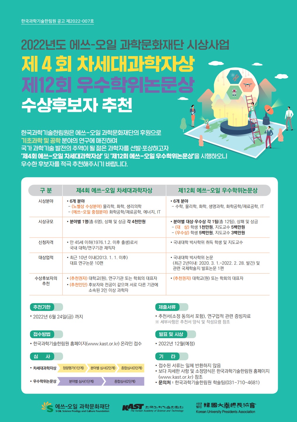 2022년도 제4회 에쓰오일 차세대과학자상·제12회 에쓰오일 우수학위논문상 수상후보자 추천 Hit 13419