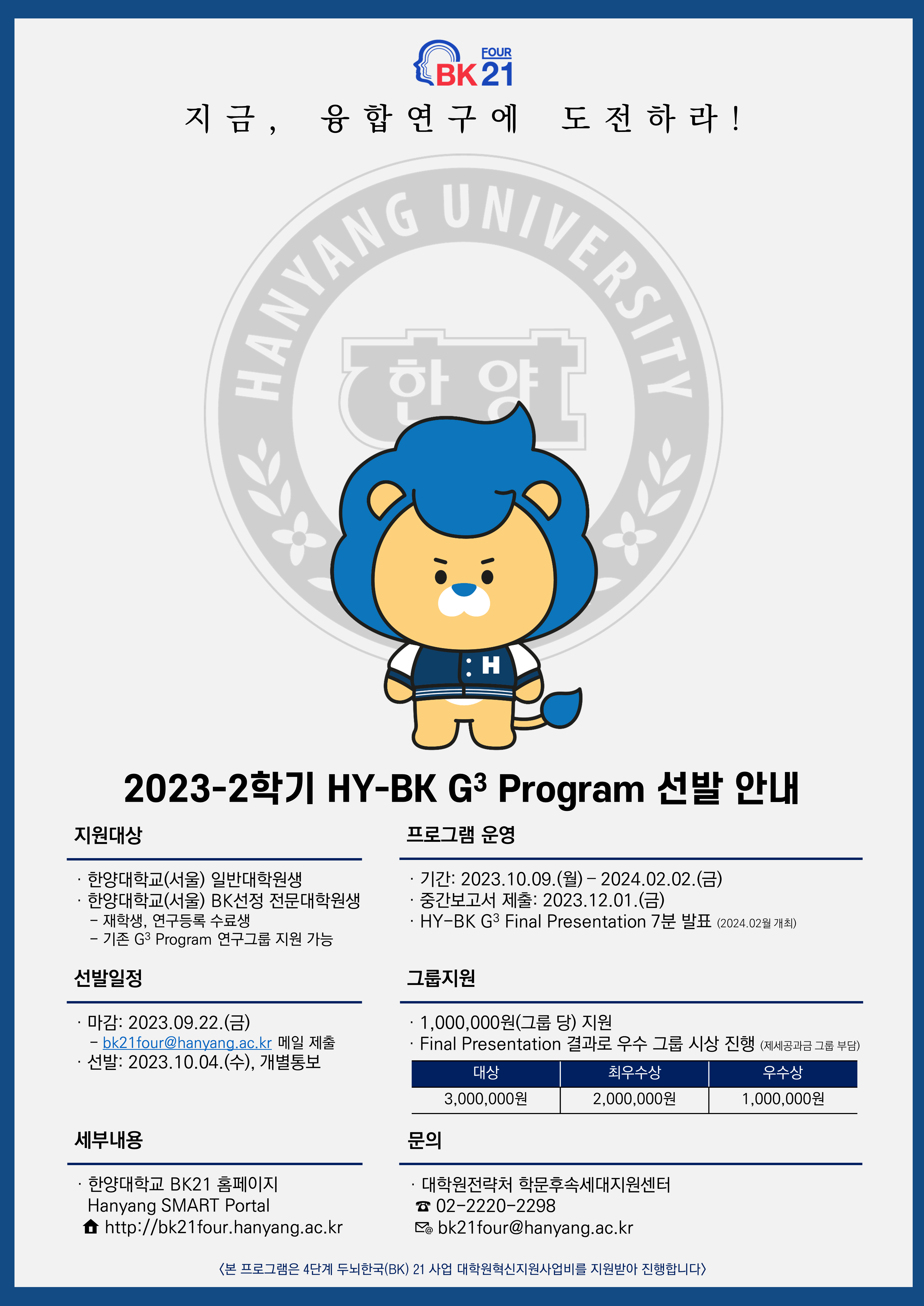 [학문후속세대지원센터] 2023-2학기 대학원생 융합연구 프로그램(HY-BK G3 Program) 안내 Hit 3214