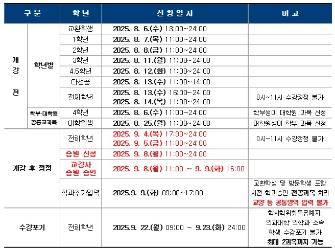 2025학년도 2학기 서울 학부 수강신청 일정을 아래와 같이 안내하오니 참고 바랍니다.