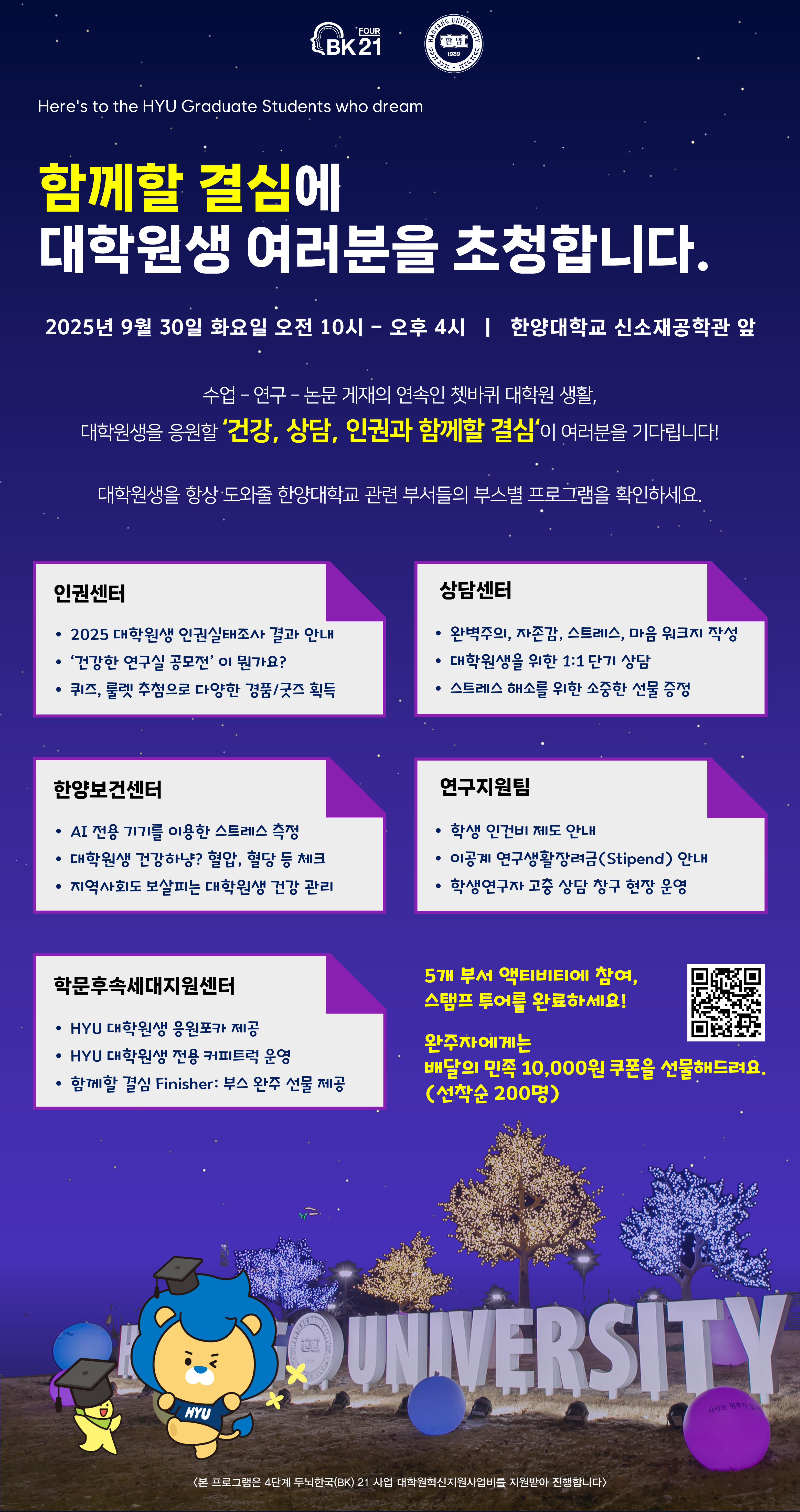 [학문후속세대지원센터] `2025 건강, 상담, 인권과 함께할 결심: HY-BK21 일반대학원생을 위한 행복찾기 페스티벌` 개최 안내