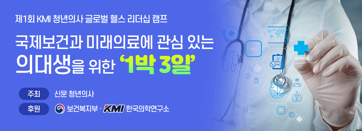 신문 청년의사와 KMI(한국의학연구소)가 국제보건 및 미래의료에 관심있는 의대생들의 실제 현장의 이야기를 듣고 진로를 모색하여 서로의 열정을 공유할 수 있는 장인 'KMI-청년의사 Global Health Leadership Camp'를 개최하오니 관심있는 학생들의 많은 참여를 바랍니다.